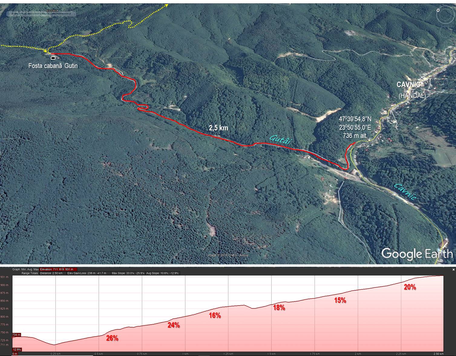 Accesul auto la fosta cabană Gutin se face pe drumul forestier de pe valea Gutâiului/Gutinului ce pornește de la ieșirea/intrarea dinspre est a cartierului Handal aflat în extremitatea vestică a orașului Cavnic. Drumul este relativ accesibil tuturor autoturismelor (una din mașinile noastre a fost un Cielo Nubira); trebuie ținut cont că rampele mai înclinate erau ravenate, e adevărat, nu foarte adânc, dar zdrumicate de un strat instabil de pietre.