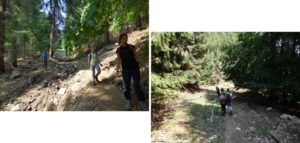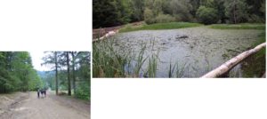 100 m mai sus pe drumul forestier marcat cu cruce albastră (traseul nostru de întoarcere) se află un mic lac de acumulare, de unde părăsim drumul cotind spre dreapta; …