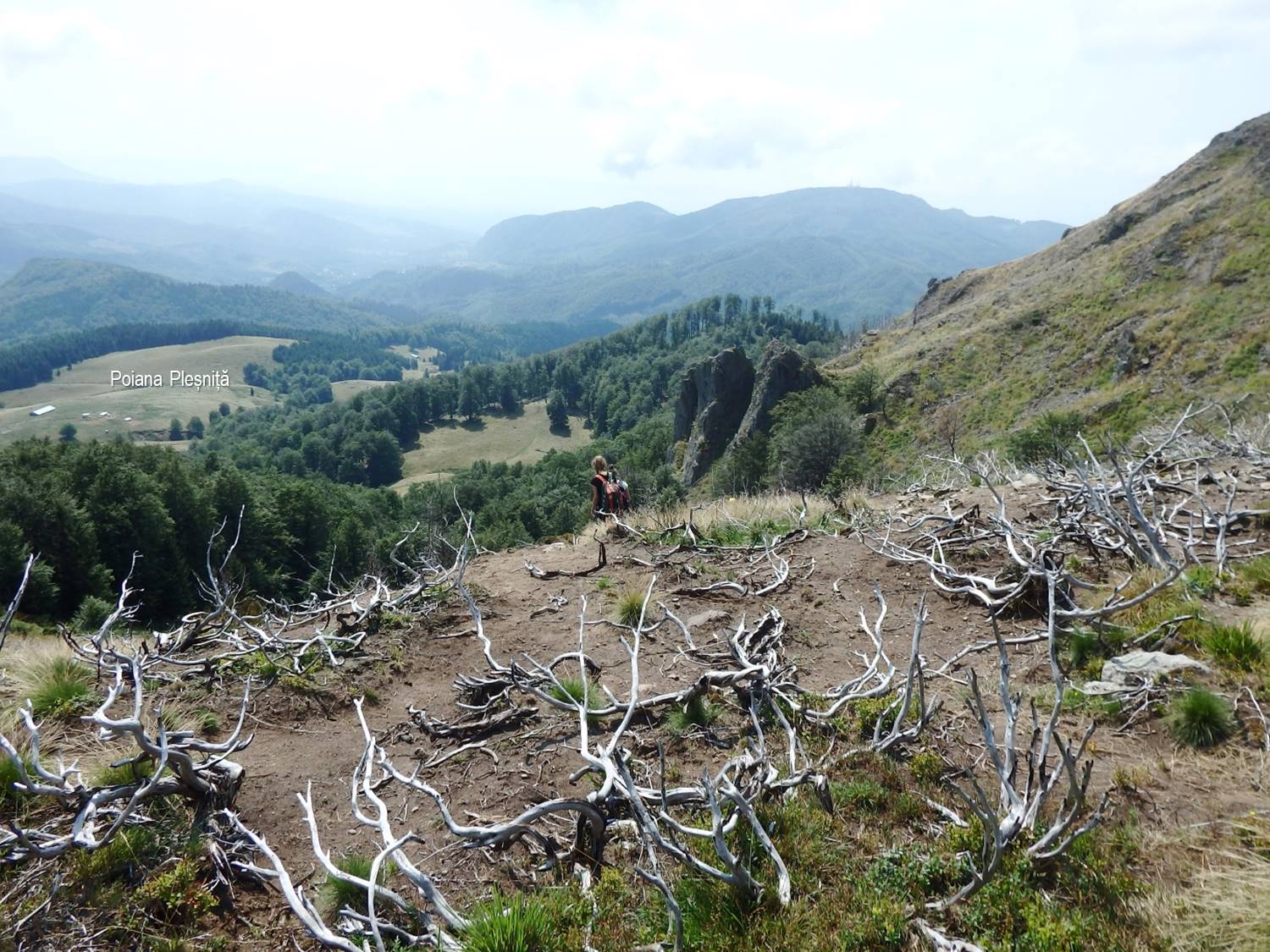 În Poiana Pleșniță îl părăsim însă, încă din capătul amonte al poienii, noi deviind spre stânga, către capătul de jos al Hornului Mare pentru a intra pe traseul “cruce albastră”; …