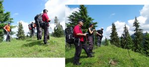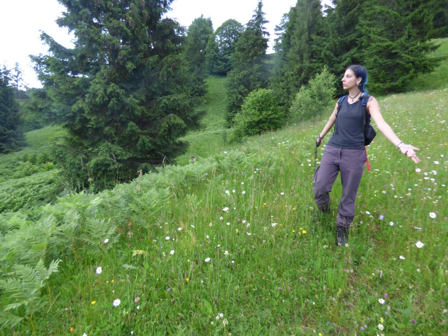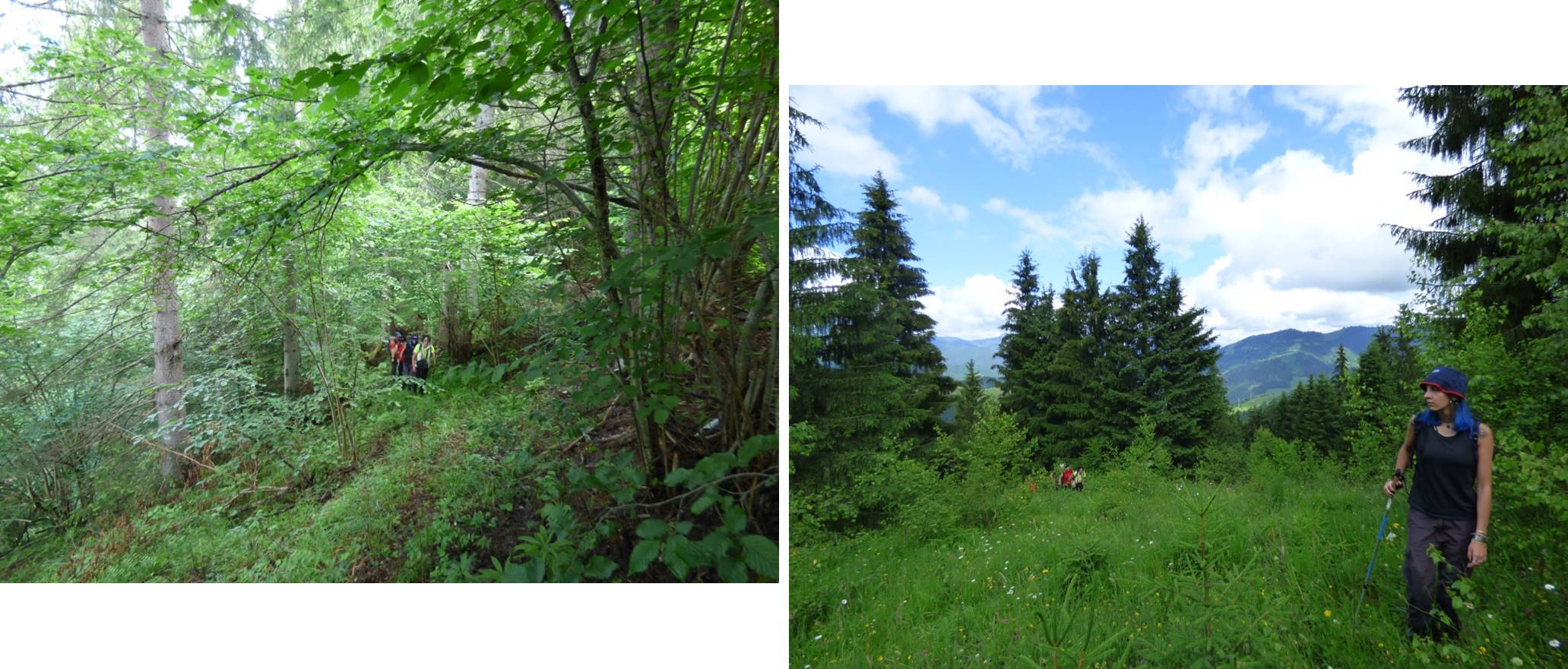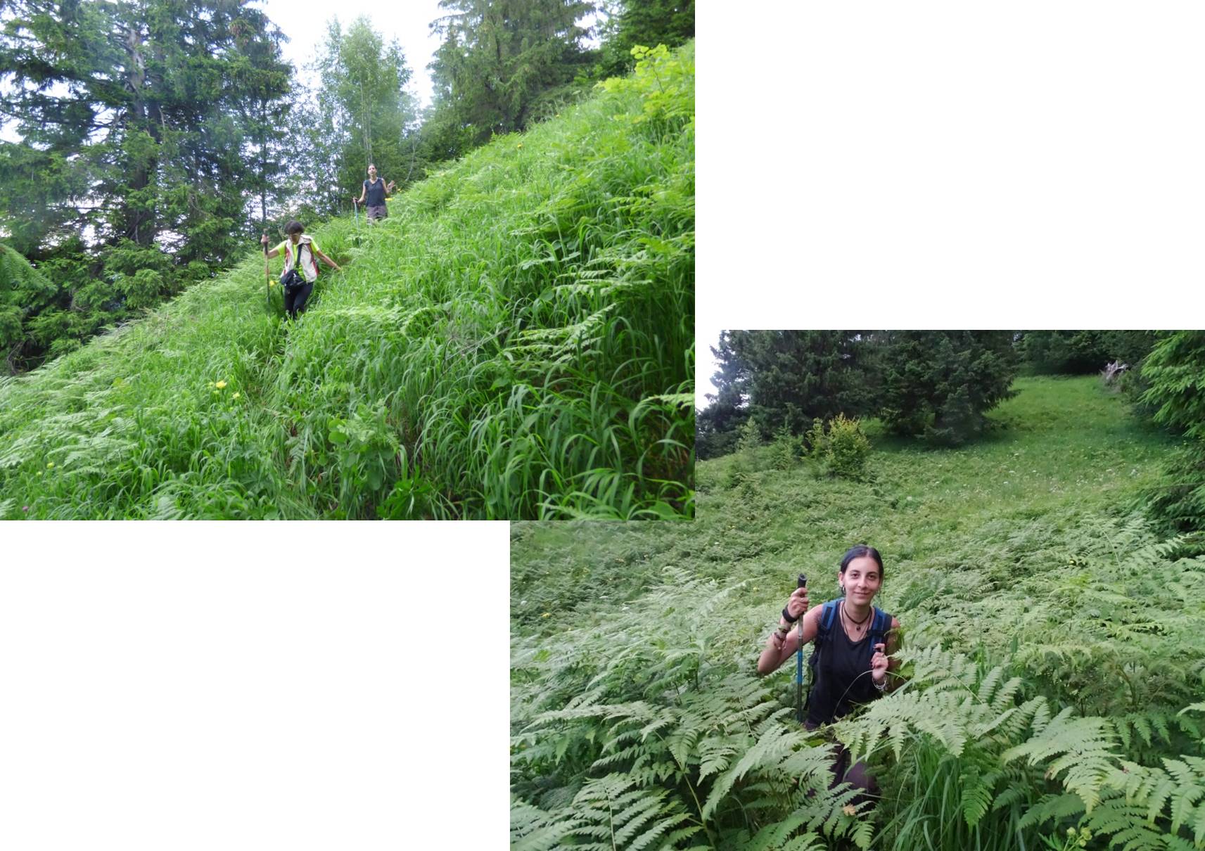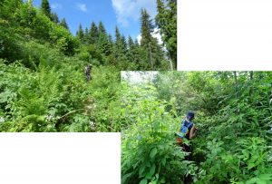 … o facem pe o veche potecă pastorală ce taie coastele vârfului pe versantul său nordic, dar care, spre final se cam încâlcește în vegetația luxuriantă ce crește peste resturile unor defrișări relativ recente !