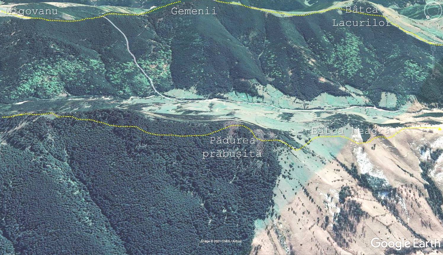 … un motiv pentru care și renunțăm la a o parcurge în întregime, mai ales că în a doua parte a sa ar trebui să urcăm un vârf împădurit, iar partea finală am văzut-o dintr-o imagine satelitară relativ recentă ca fiind afectată de o furtună ce a prăbușit pădurea pe o suprafață destul de mare !
