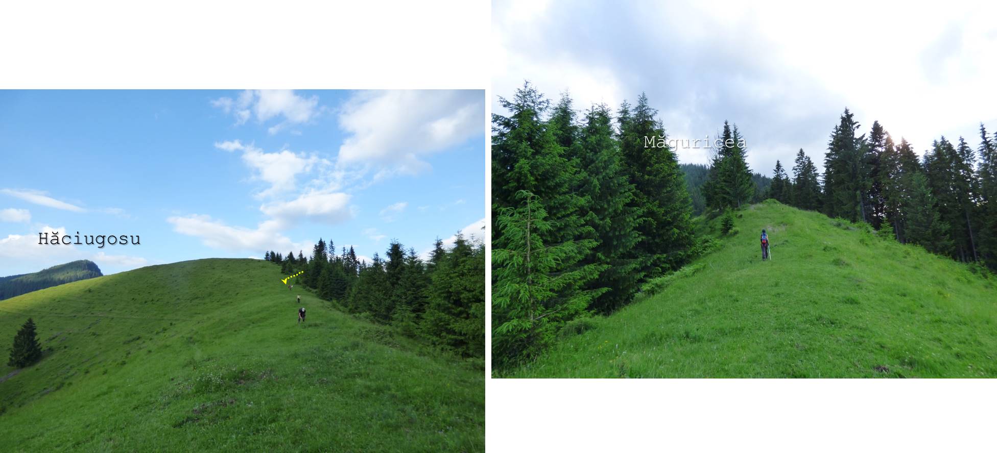 Ne … codim totuși să o facem prea direct, refuzând ambele brațe ale drumului de tractor ce suie spre muchia Hăciugosului, așa că, de pe drum, continuăm, …