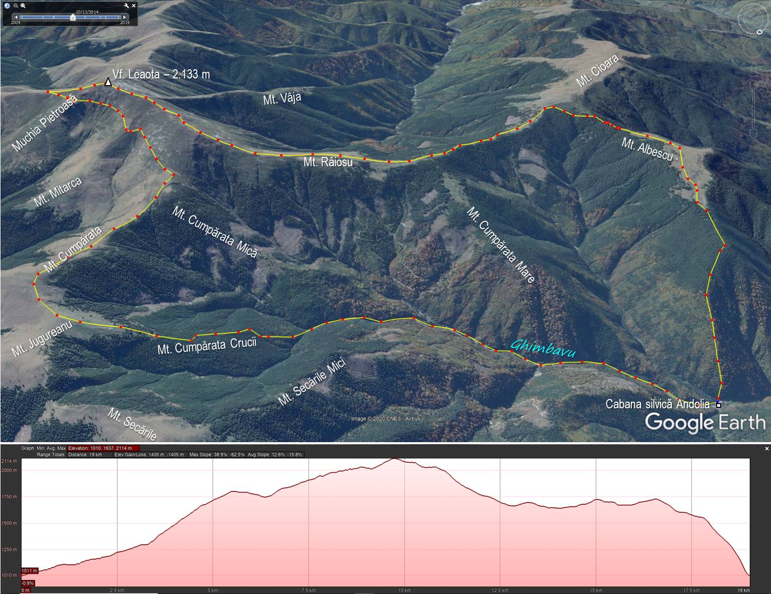 Traseu: Cabana Andolia – Valea Ghimbavului – Mt. Cumpărata Crucii – Mt. Mitarca – Vf. Leaota – Mt. Râiosu – Mt. Cioara – Mt. Albescu – Cabana Andolia