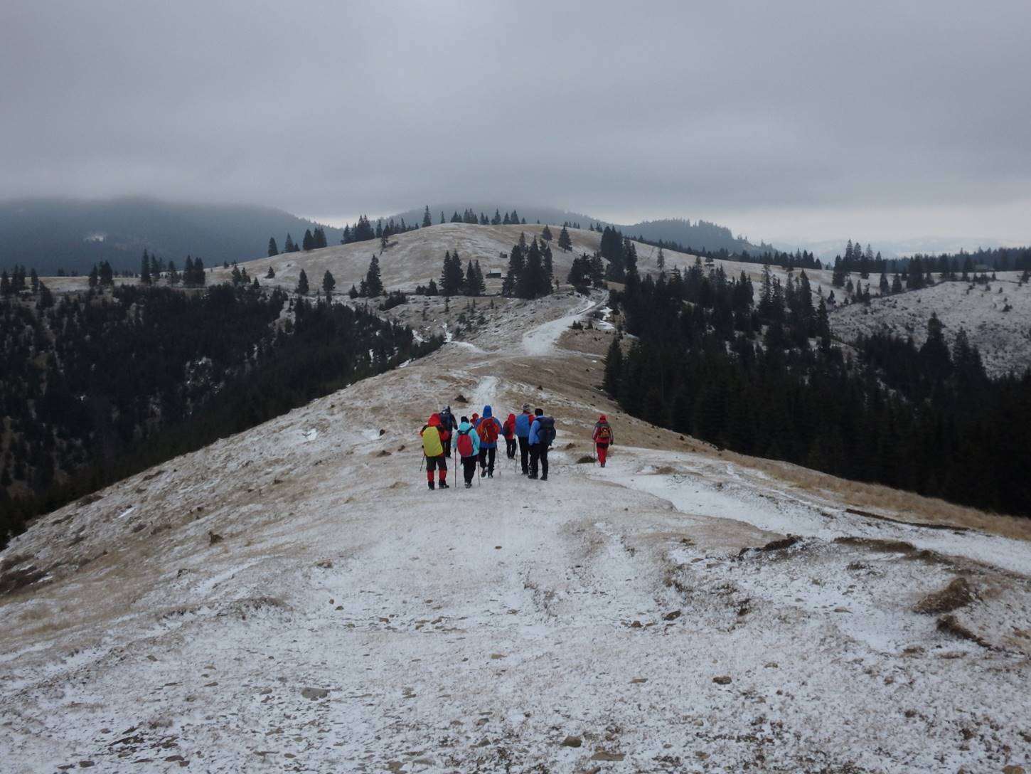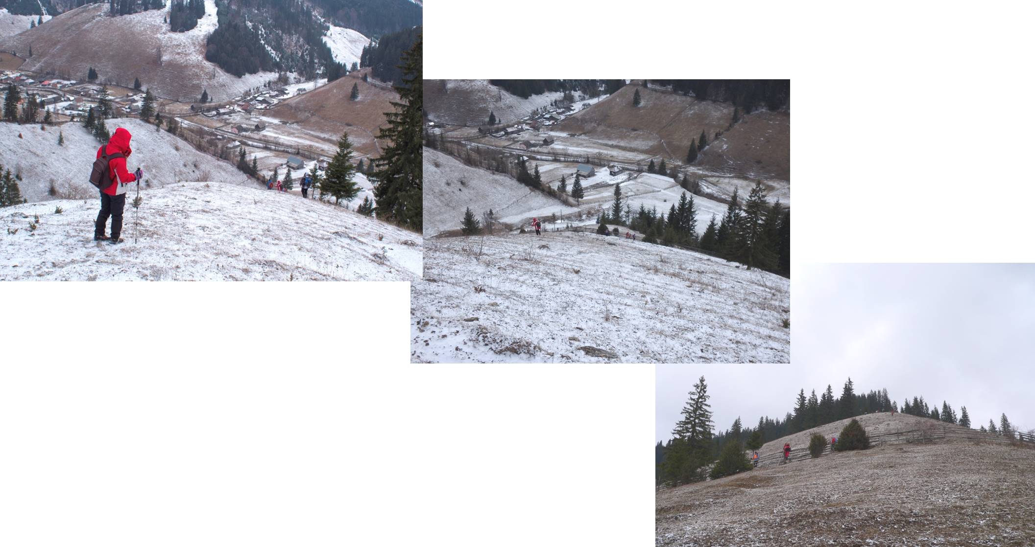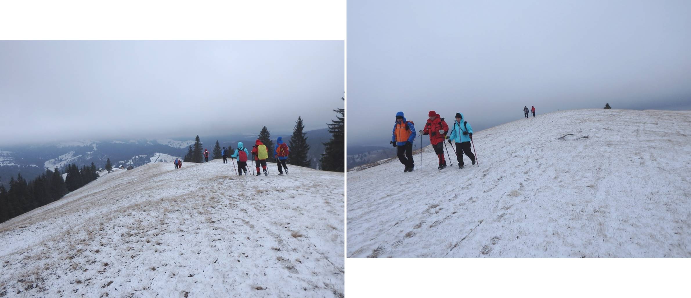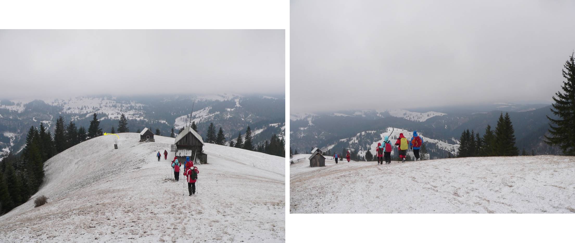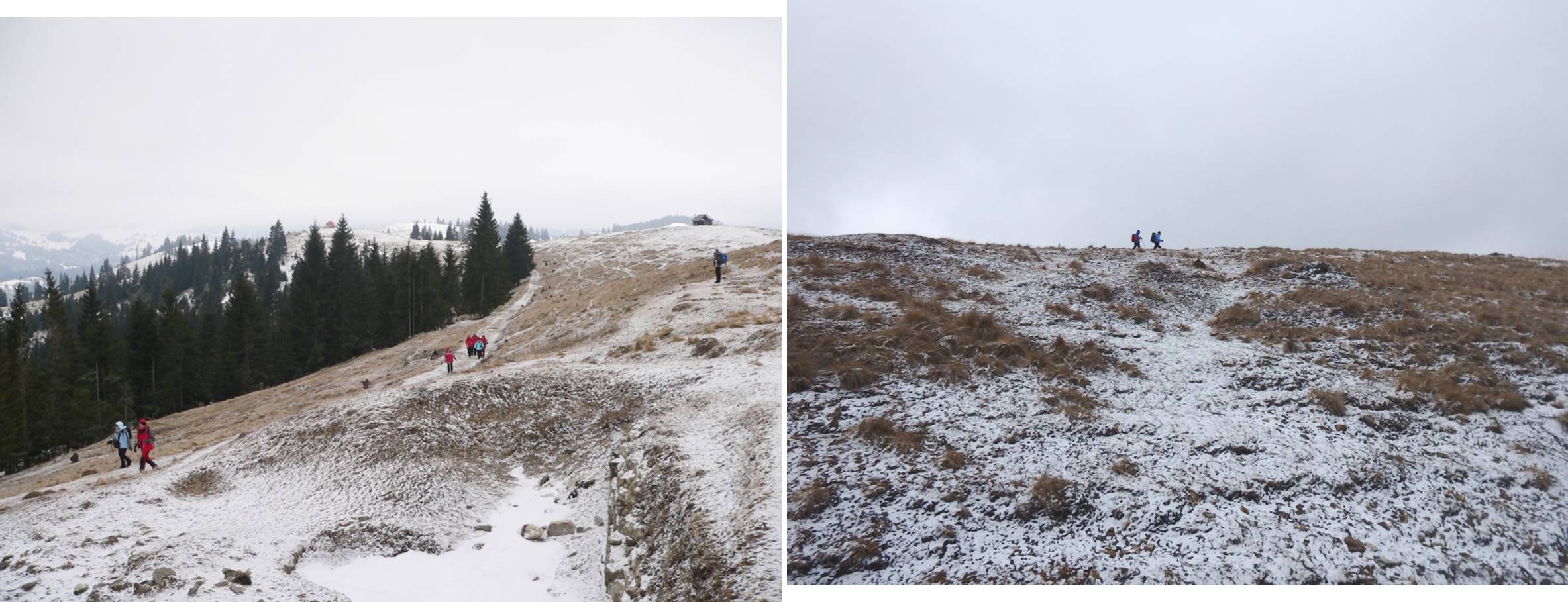 Dincolo de vârful spre care suim, cotim ușor spre dreapta (brațul de pe piciorul din stânga sfârșește în valea Bicăjelului) !