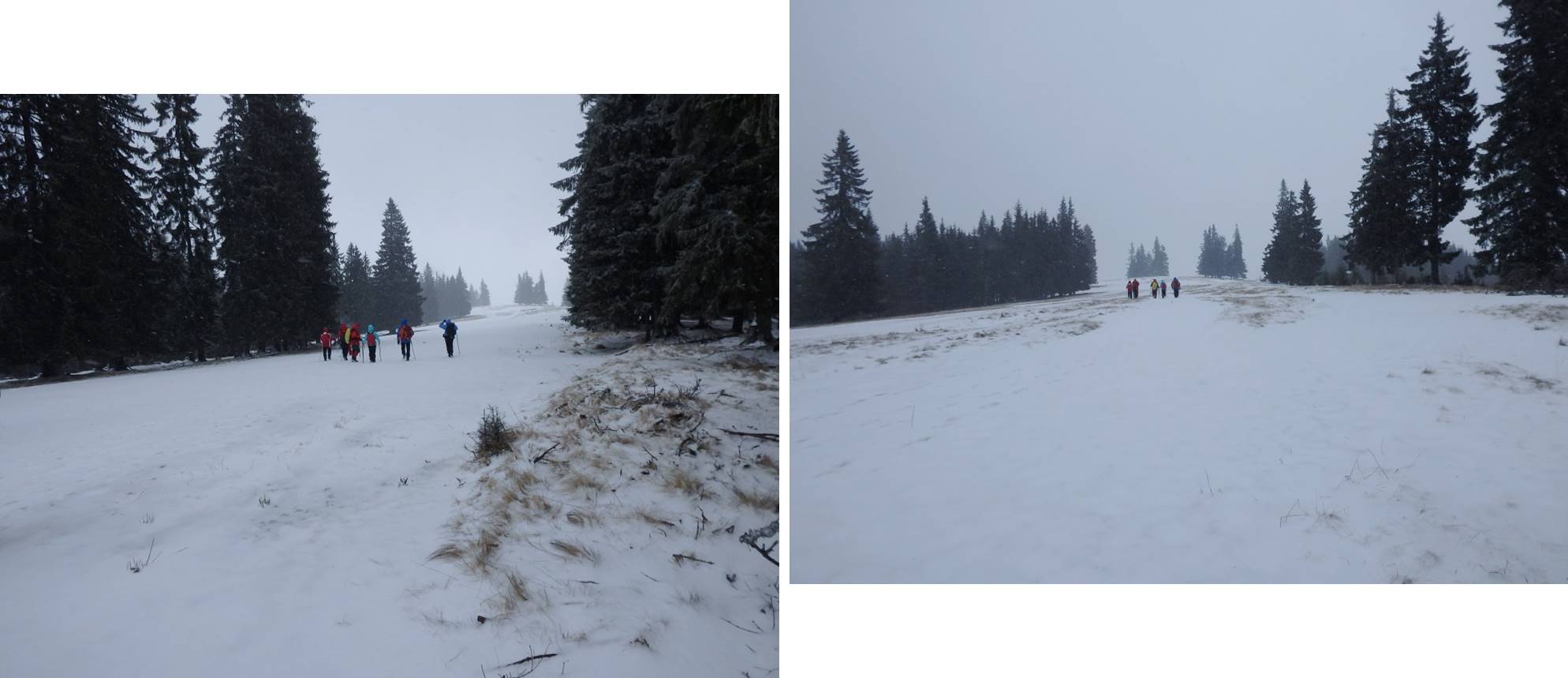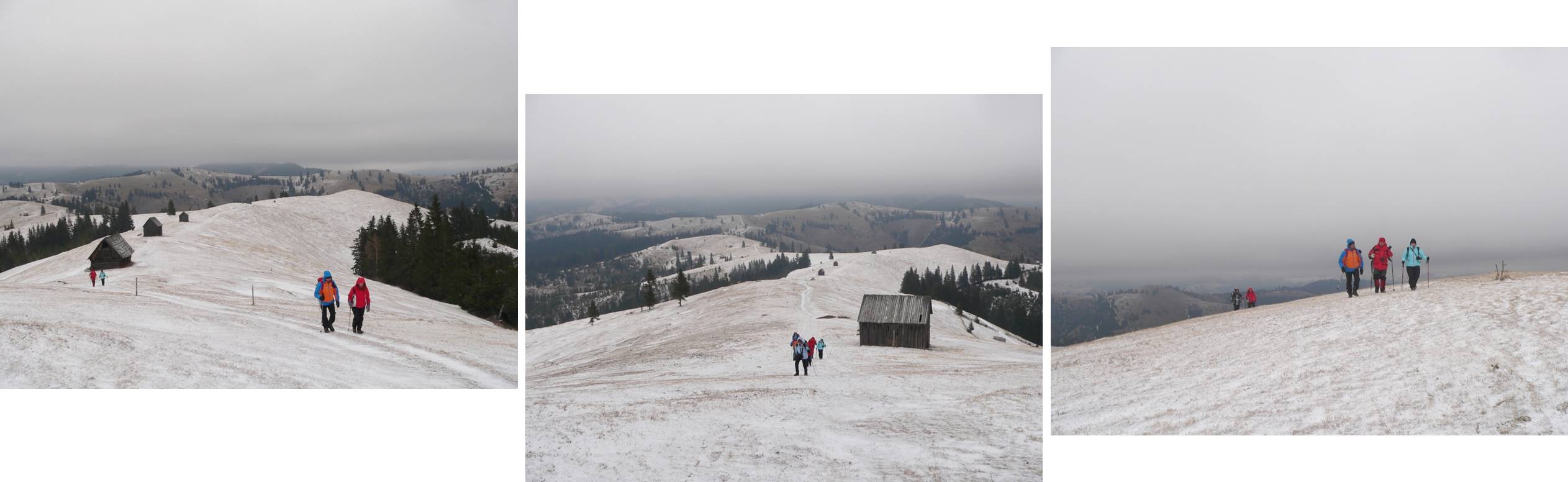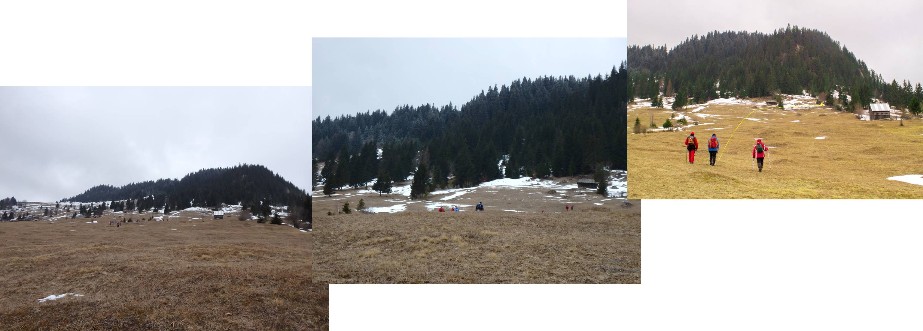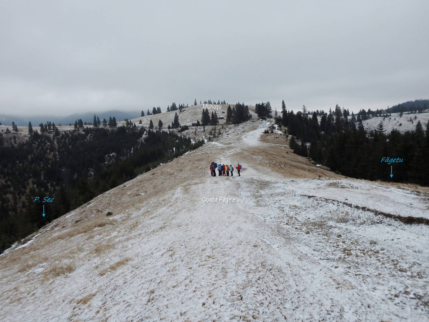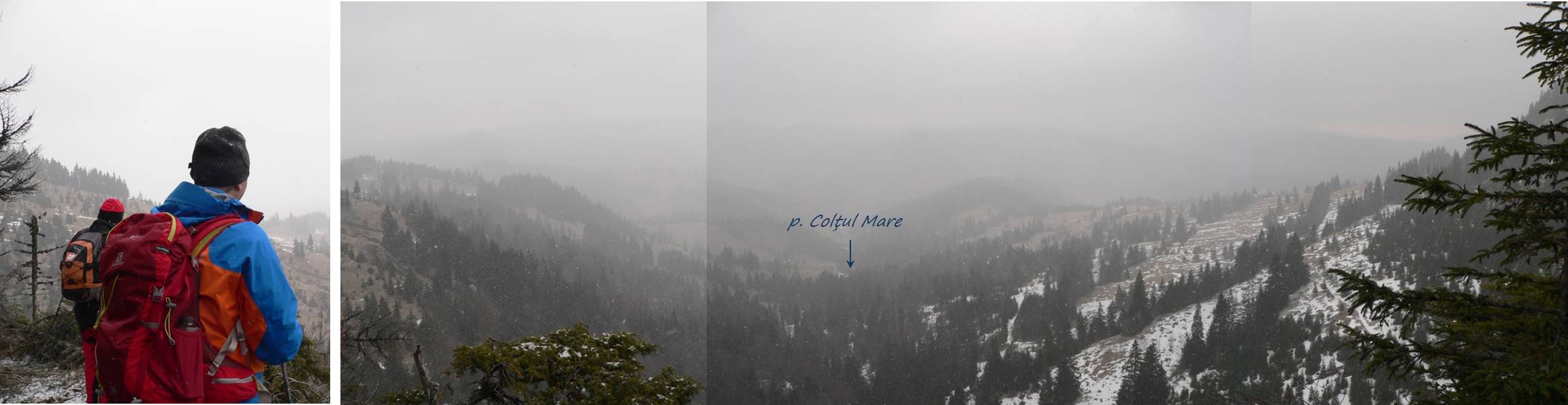 Dincolo de vârful spre care suim, cotim ușor spre dreapta (brațul de pe piciorul din stânga sfârșește în valea Bicăjelului) !
