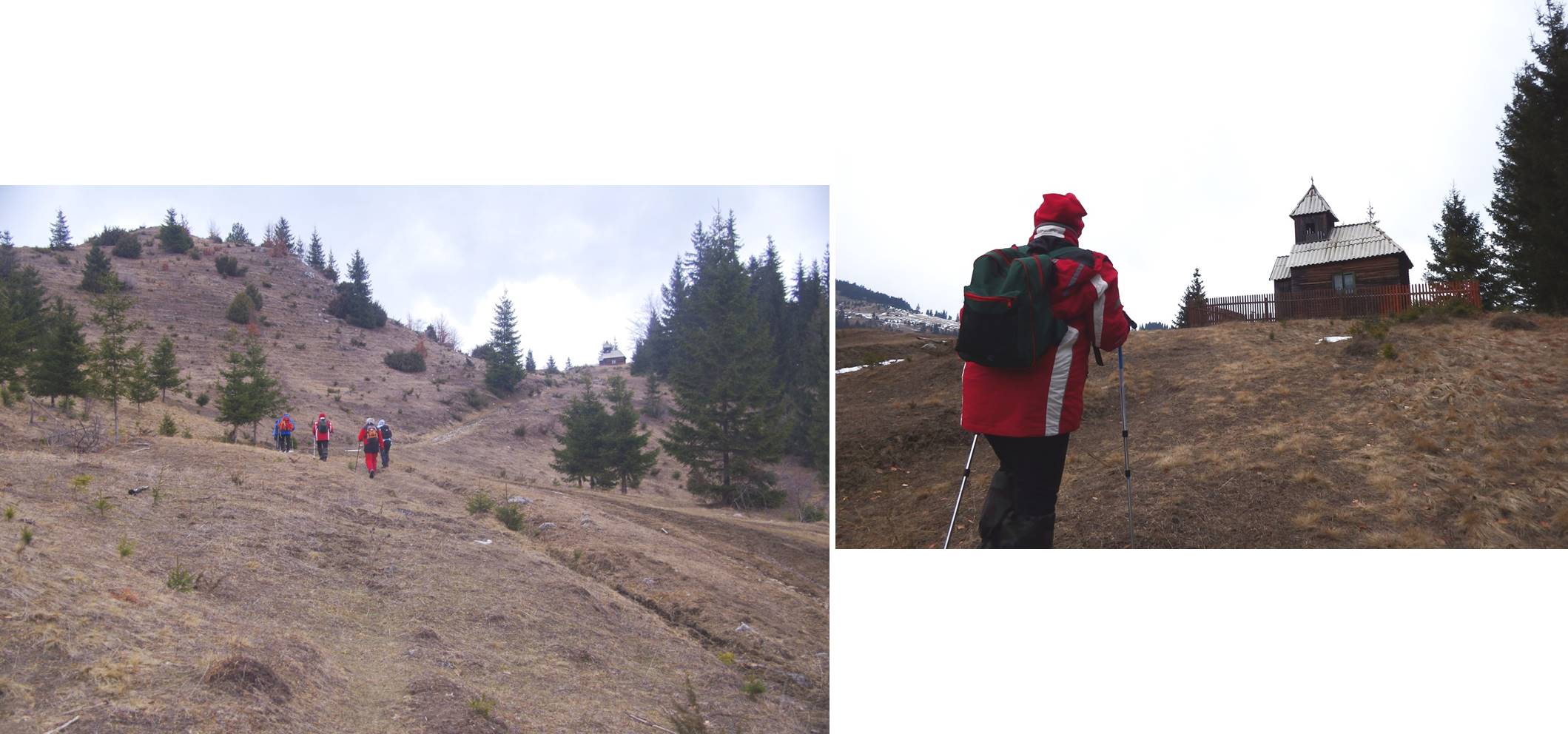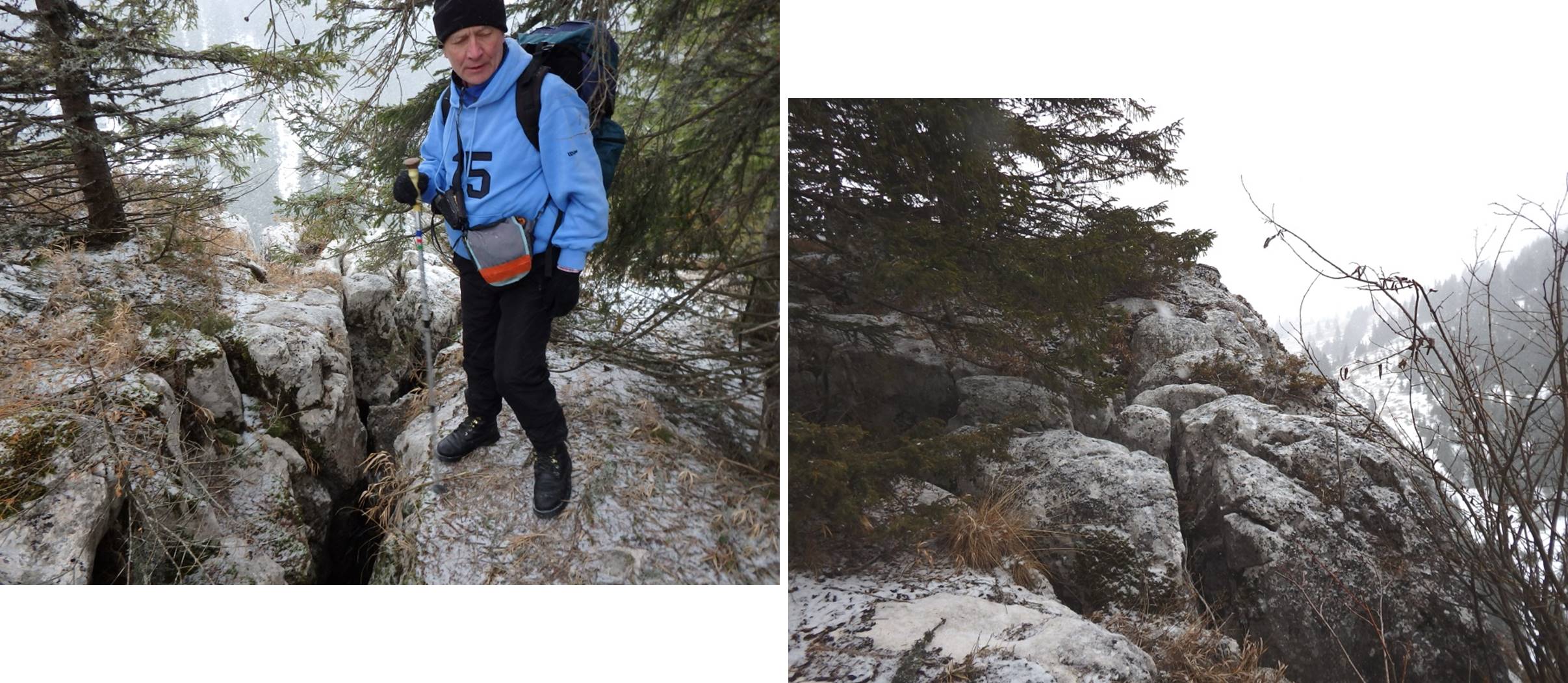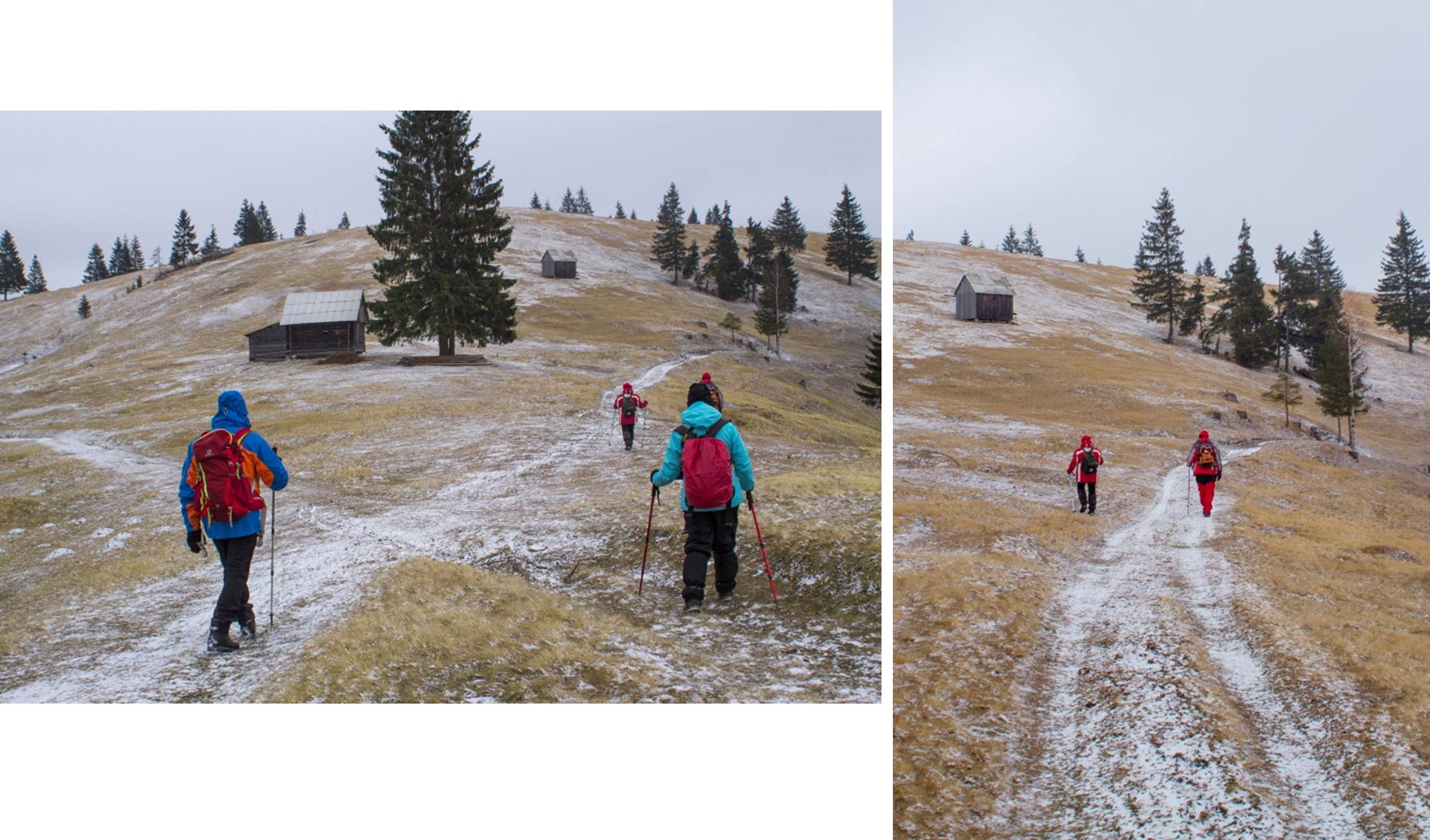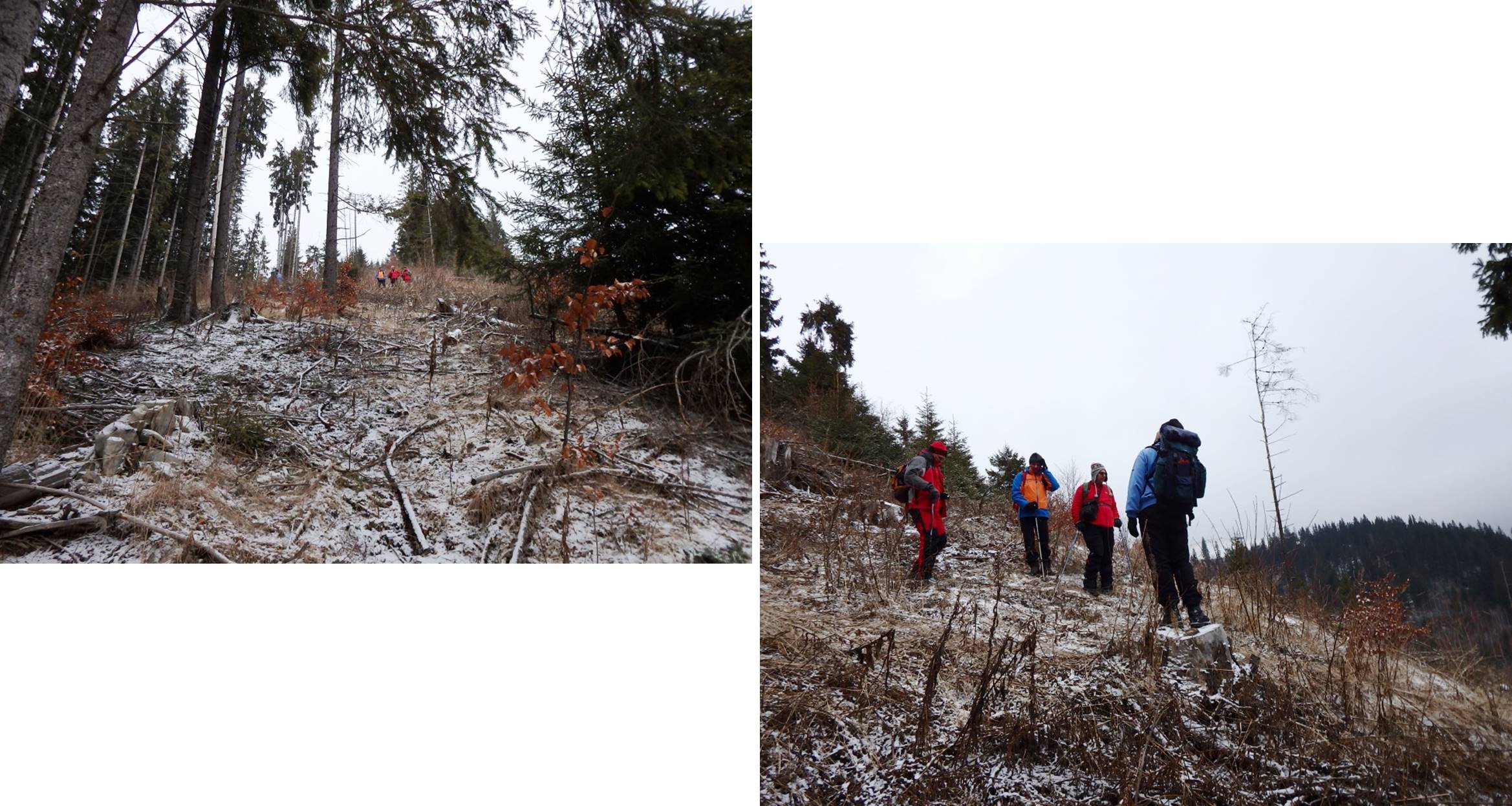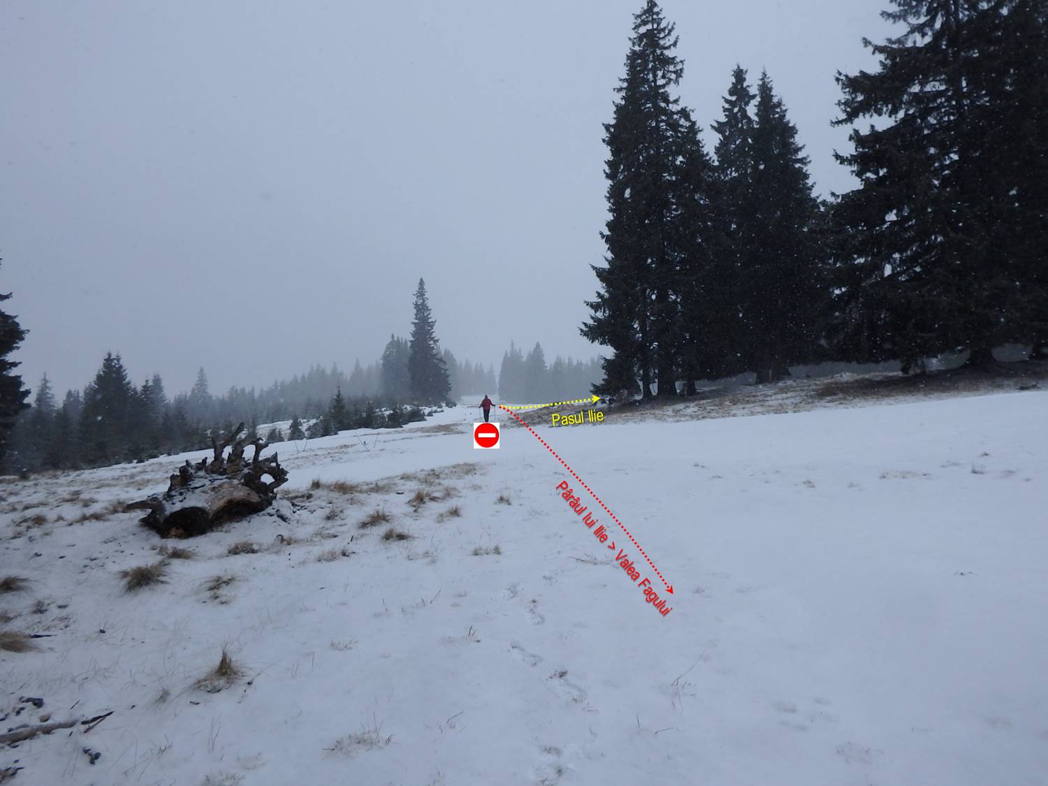 Dincolo de vârful spre care suim, cotim ușor spre dreapta (brațul de pe piciorul din stânga sfârșește în valea Bicăjelului) !