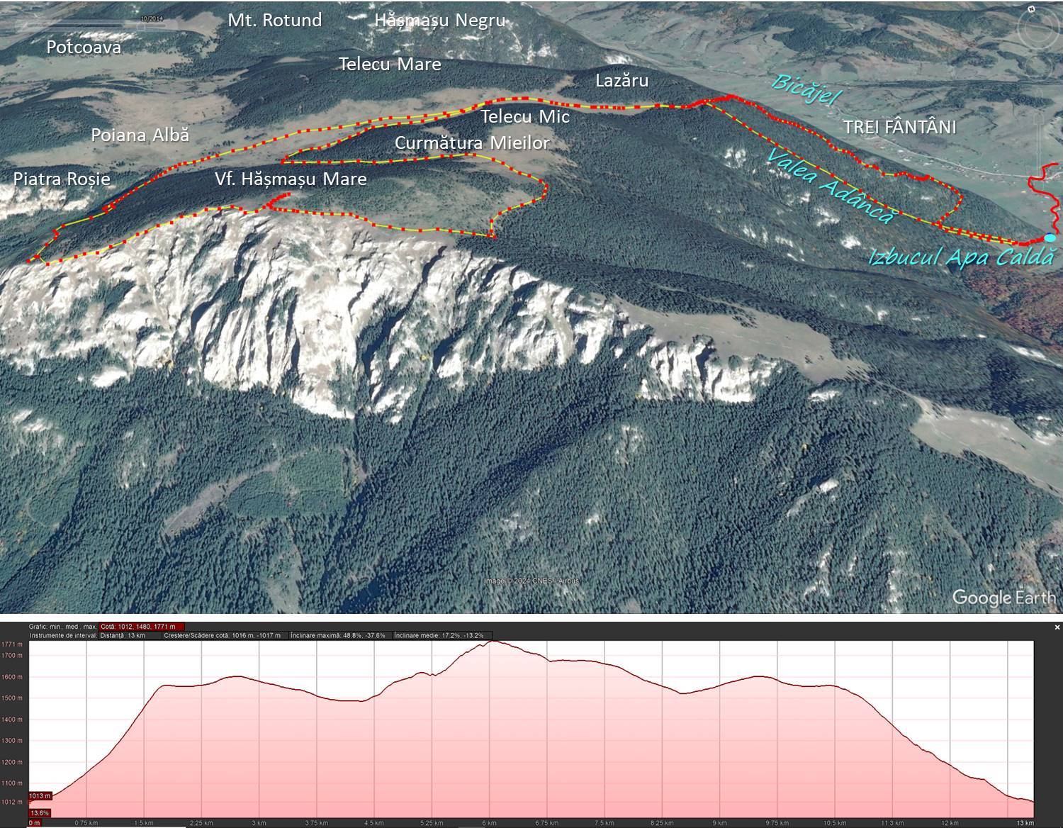 Traseu (13 iulie 2024): TREI FÂNTÂNI (Apa Caldă) – Valea Adâncă – Poiana Lazărului – Poiana Telecului – Poiana Albă – Abruptul Hășmașului Mare – Vf. Hășmașu Mare – Șaua Mieilor – Poiana Albă – Poiana Telecului – Poiana Lazărului – Piciorul Lazărului – Apa Caldă