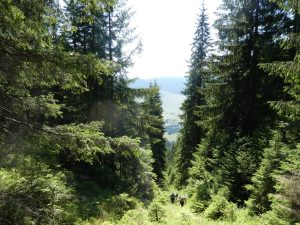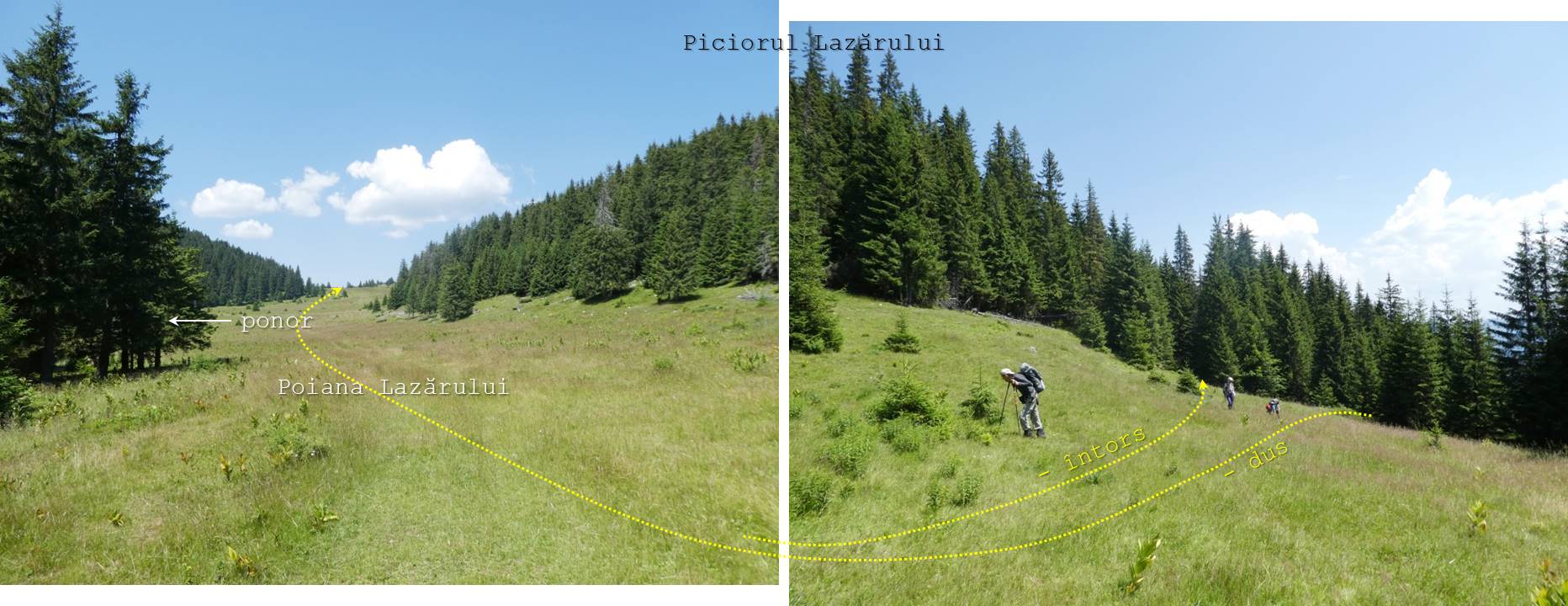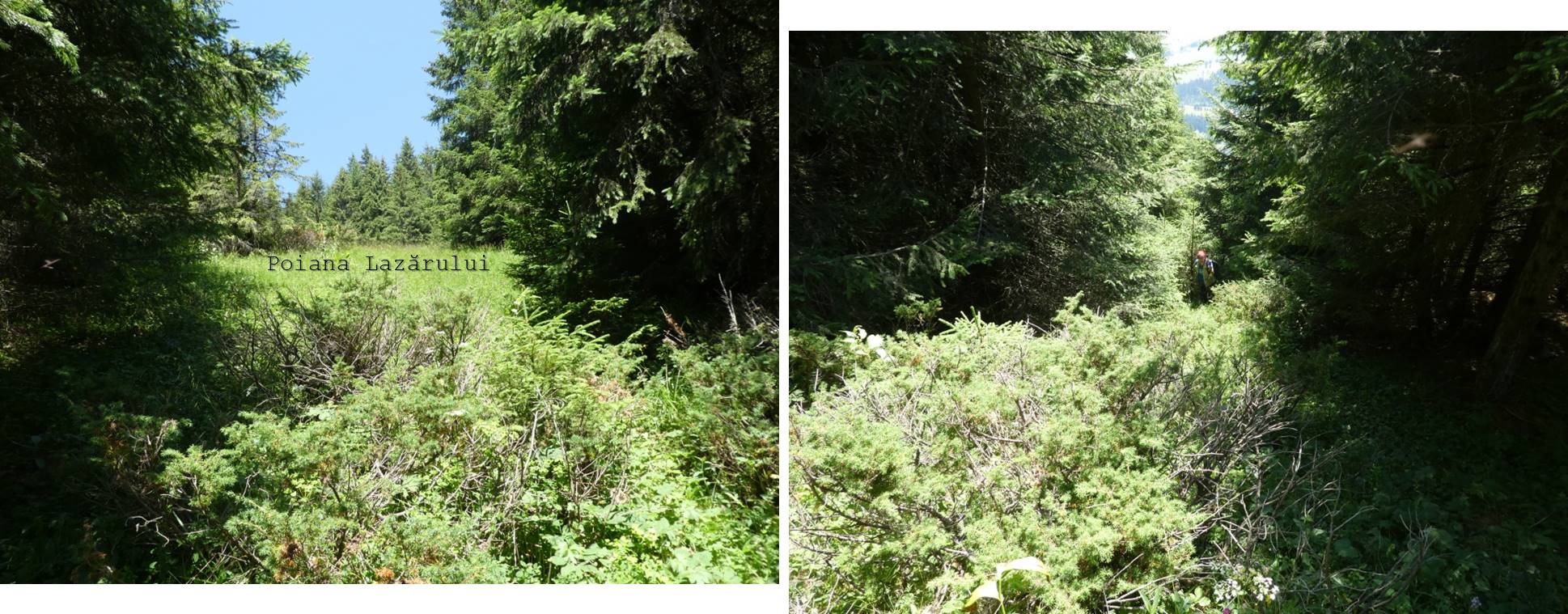 Alegem să coborâm pe Piciorul Lazărului, urmând o veche potecă pastorală, utilizată ca traseu de maratoniștii montaniarzi și, ca atare, semnalată sporadic cu puncte albastre. Imediat cum părăsim Poiana Lazărului, urmează un sector încă poienit, dar, rapid, descendent !