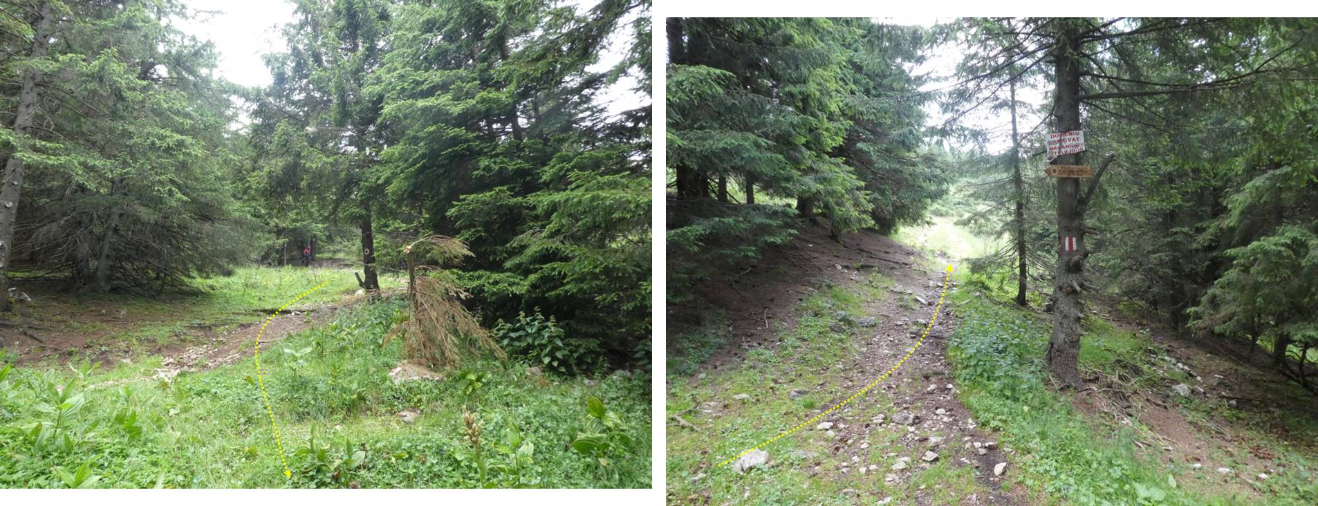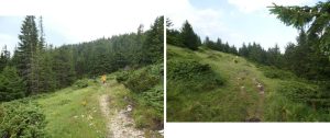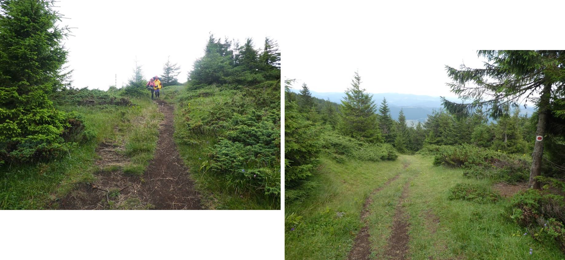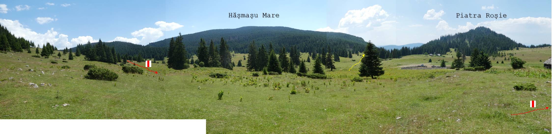 … unde traversăm poteca de culme a Munților Hășmaș, slab marcată cu bandă roșie. Ne îndreptăm spre obârșia pârâului ce coboară spre Olt printre Piatra Roșie și versantul nordic al Vârfului Hășmașu Mare.