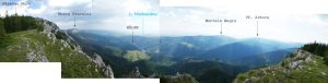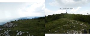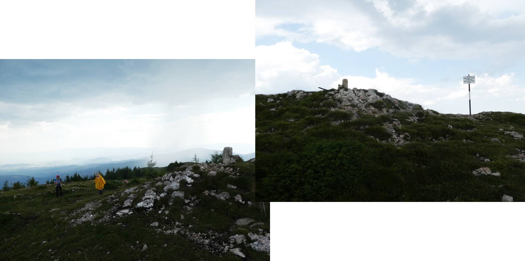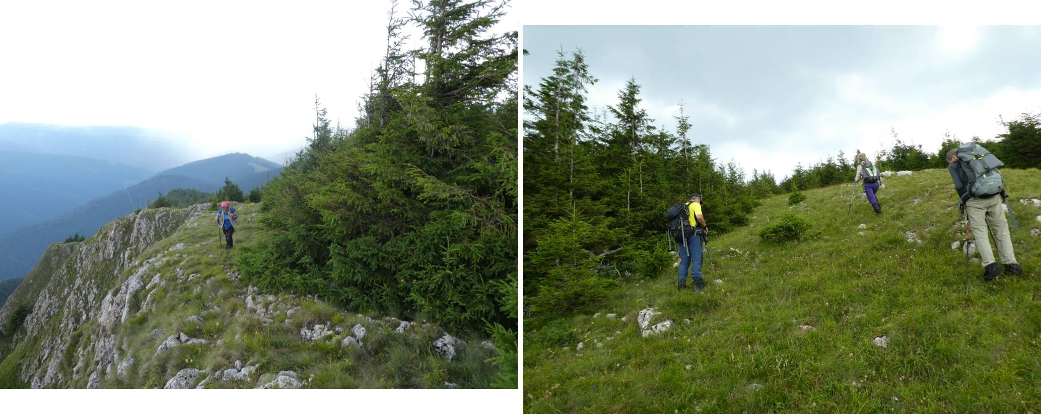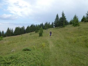 Coborâm de pe vârf, spre sud, pe poteca jalonată de stâlpi de marcaj (din lemn), …