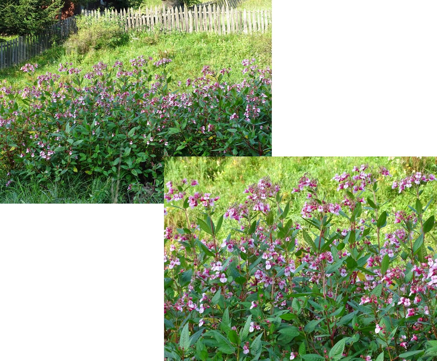 … se răsfață în soarele dimineții un răzor de Impatiens balsamina, o floare adusă de prin India care crește acum la noi și subspontan.