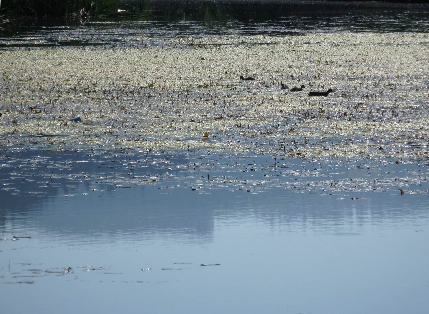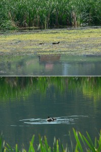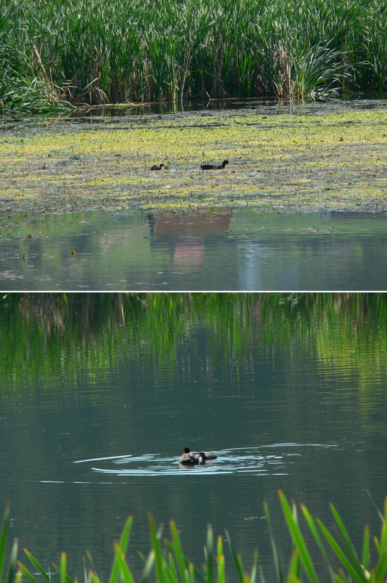 Nu e rață (licență … poetică), ci o lișiță cu pui (Fulica atra) !