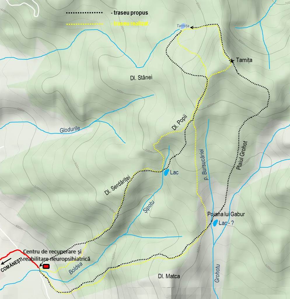 Traseu: CRRN Dărmănești/Vermești/Comănești – Piciorul Boldea – Poiana lui Gabur – Dl. Popii – Vf. Tarnița – Răsuflătorile Calde – Lacul Tarnița – Dl. Popii – Valea Șipotu – Dl. Serdăriței – CRRN Dărmănești