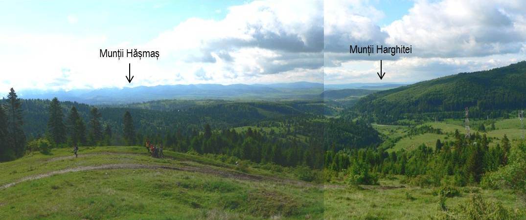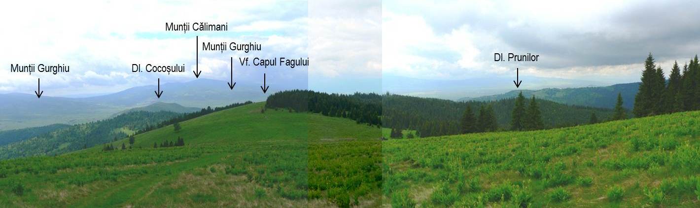 În față, dincolo de Vârful Capul Fagului, Depresiunea Giurgeu și o parte din munții ce o înconjoară; închid orizontul spre nord, Munții Călimani !