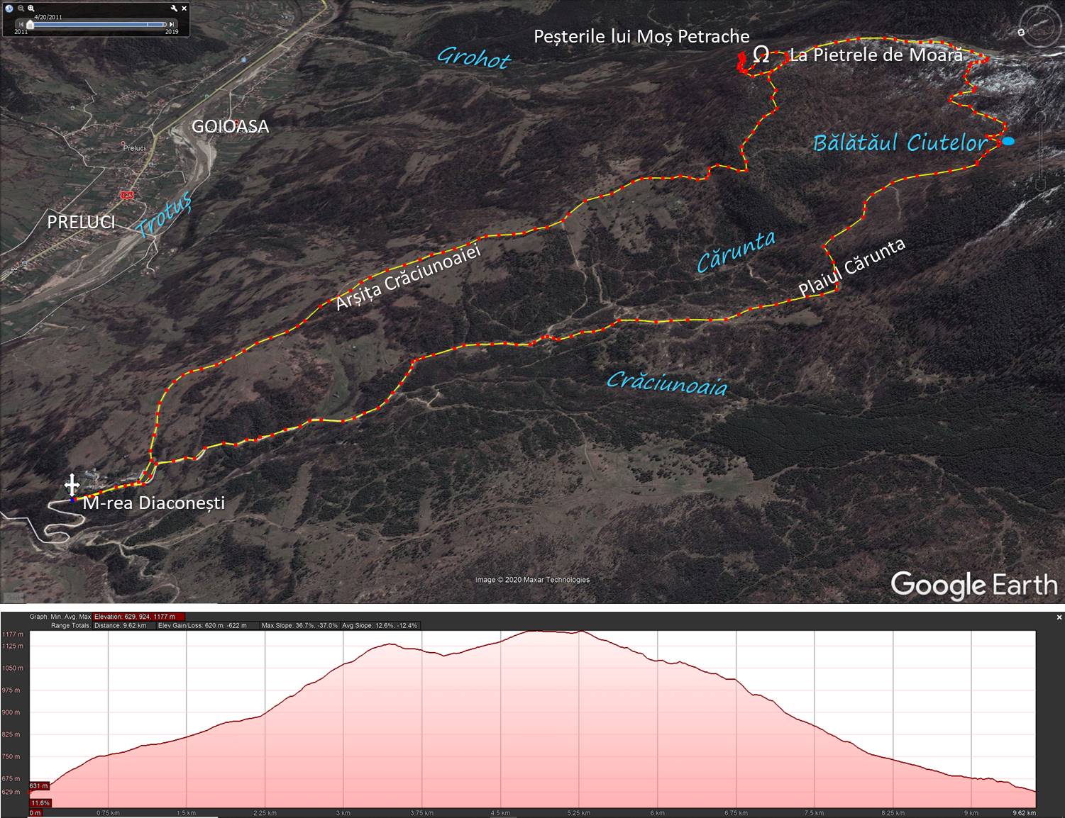 Traseu: M-rea Diaconești/Preluci – Arșița Crăciunoaiei – La Pietrele de Moară – Bălătăul Ciutelor – Plaiul Cărunta – M-rea Diaconești