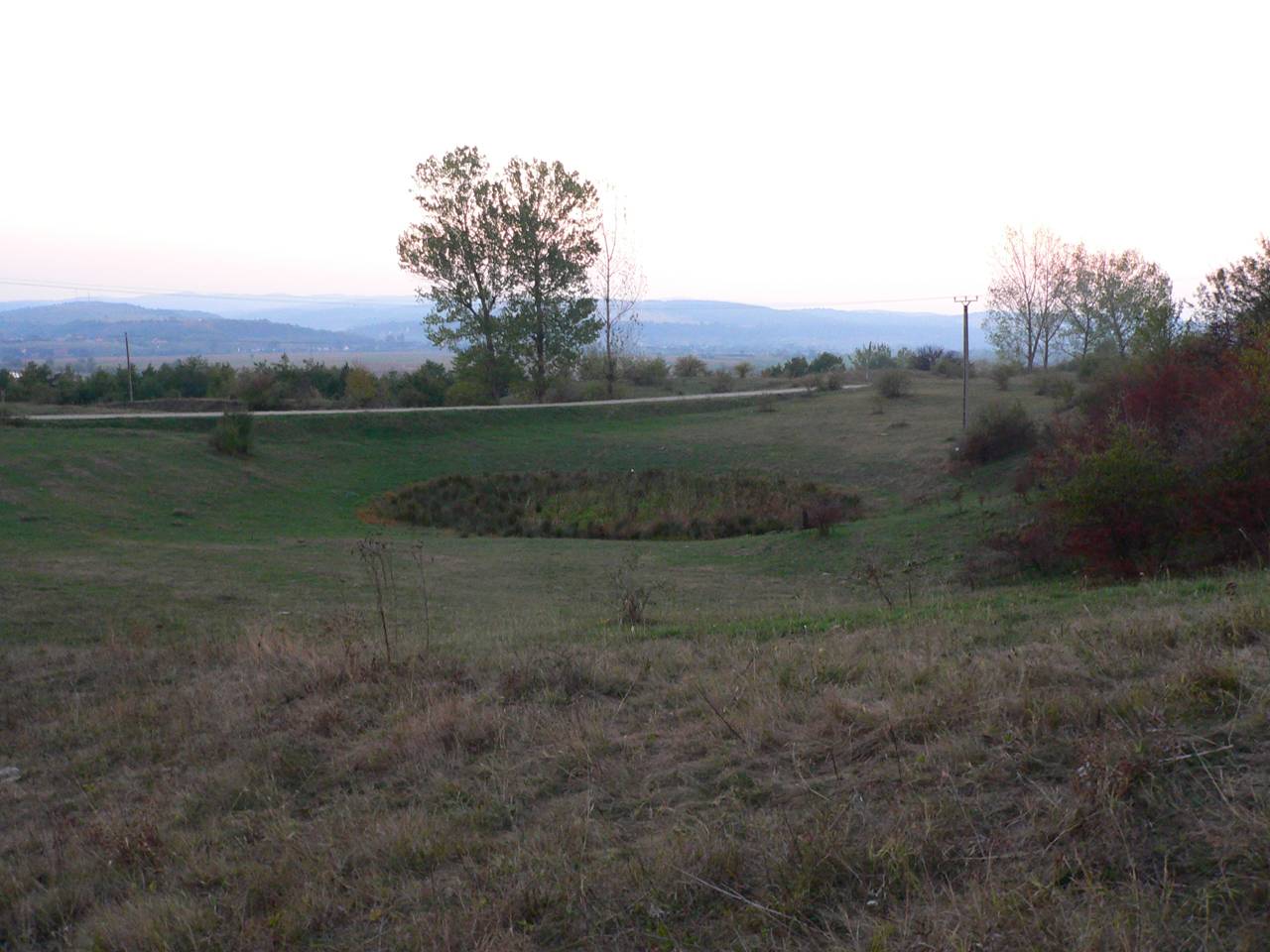 Dar, la doar 150 de metri, ne oprim, deoarece remarcăm pe stânga drumului, pe o treaptă inferioară a aceleiaşi alunecări ce a generat Lacul Andreoaie, ochiul circular al unei bălţi temporare cu diametrul de 20 m, al cărei fund este cucerit de stuf. După 200 m (peste alţi 200 am intra în sat) părăsim drumul şi suim pe versantul din stânga, înaintând oarecum paralel cu drumul.