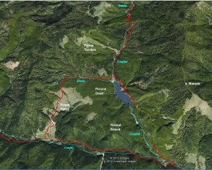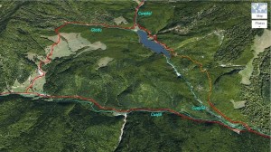 Sugerăm ca punct de intrare în acest circuit capătul din aval al lacului, locul pe unde scapă apa din cuveta lacului.