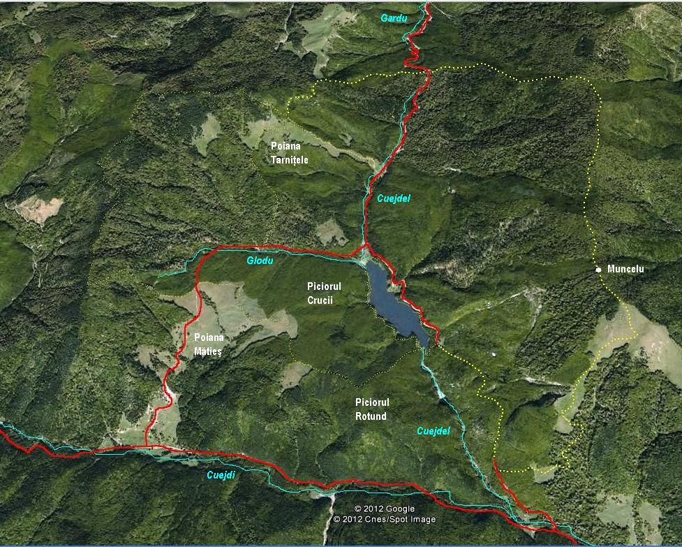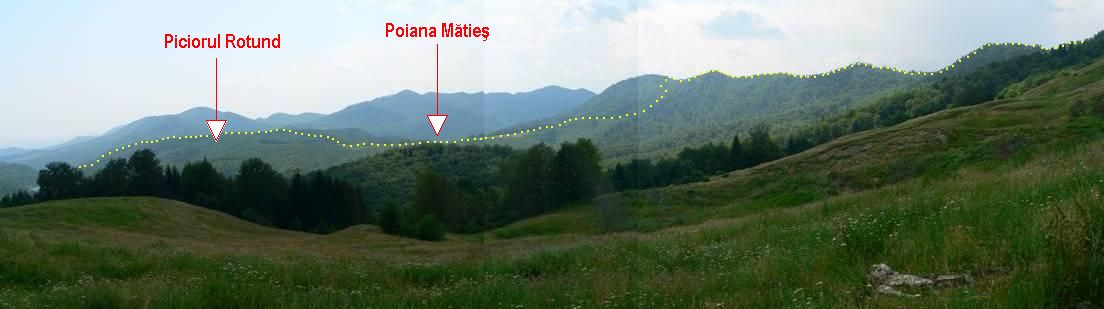 Rămânem pe culmea relativ orizontală şi ieşim foarte curând într-o poiană. Păstrăm direcţia nord-vest şi, după traversarea unor pâlcuri de pădure, pătrundem în complexul de poieni ale Mătieşului. Străbatem poienile pe marginea lor altitudinală superioară, menţinându-ne, astfel, pe linia de altitudine maximă a interfluviului (aici format de Piciorul Crucii – de la care derivă cea de a doua denumire a lacului, Lacul Crucii, care se vrea a se oficializa !), traversăm drumul forestier ce face legătura dintre valea Cuejdiului şi valea Glodului şi le părăsim prin extremitatea lor nord-vestică.