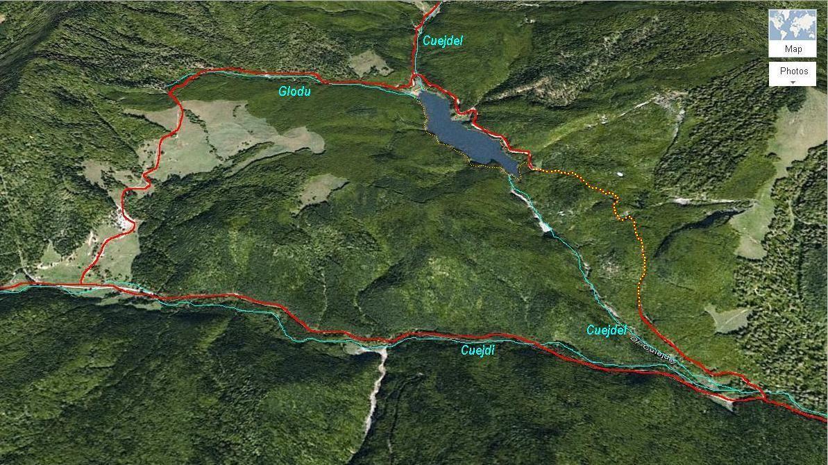 Putem alege şi o altă variantă! De la confluenţa dintre Cuejdi şi Cuejdel, continuăm încă 3 km pe Cuejdi, la deal, până la o nouă intersecţie dintr-o largă poiană (Mătieş) ce se deschide spre dreapta. După 2 km prin poiană, spre nord, drumul intră în pădure şi coteşte curând spre est, coborând pe valea pârâului Glodu până la vărsarea lui, în coada Lacului Cuejdel. Descrierea acestei variante este doar … livrescă, aşa că nu putem spune nimic despre starea drumului.