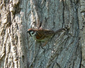 … sau chiar cvasi … banale (vrabie-de-câmp – Passer montanus – seamănă cu masculul vrabiei-de-casă – Passer domesticus -, datorită barbișonului negru, având însă în plus două pete negre pe obraji), …