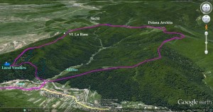 Din centrul poienii continuăm pe un drum format de-a coasta, pe versantul estic al vârfului, cel stăpân peste Poiana Archita dinspre nord, drum care străbate pădurea rară de pe versant. După … un puseu altitudinal înnăbuşit repede, urmează o trecere de pe o curbă de nivel pe alta pe o diferenţă de doar câţiva metri. Ajungem pe coama versantului nord-estic pe care un alt drum urcă spre vârf/coboară în valea Mălinei. Pur şi simplu îl traversăm, deoarece drumul pe care am venit este prelungit de o veche potecă, încă bine conturată, ce încinge parte din coastele nordice ale vârfului. O scurtă coborâre ne lasă la nivelul unei mici obârşii pe care o ocolim pe deasupra izvoarelor sale mocirloase (pe unde poteca devine mai mult decât … neclară !) şi ieşim pe muchia versantului nord-vestic al vârfului, interfluviu între valea Mălinei şi valea Jlabăului, un alt afluent important al pârâului Iapa. Urmăm spre nord un drum de exploatare care urcă din stânga, dinspre valea Jlabăului şi urmează interfluviul. Traversăm o şa aproape imperceptibilă, şi din vârful contrapantei, unde se află borna silvică 63 – marcată pe un fag, dar şi pe o piatră – de unde drumul coteşte spre stânga, îl părăsim şi avansăm pe o potecă destul de bine evidenţiată. În felul acesta rămânem pe versantul stâng al Mălinei, în timp ce drumul părăsit se instalează pe un interfluviu între pârâul Jlabău şi un alt pârâu, afluent al Iepei, intercalat între Mălina şi Jlabău.
