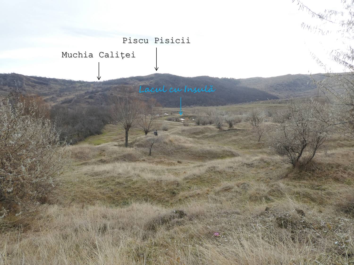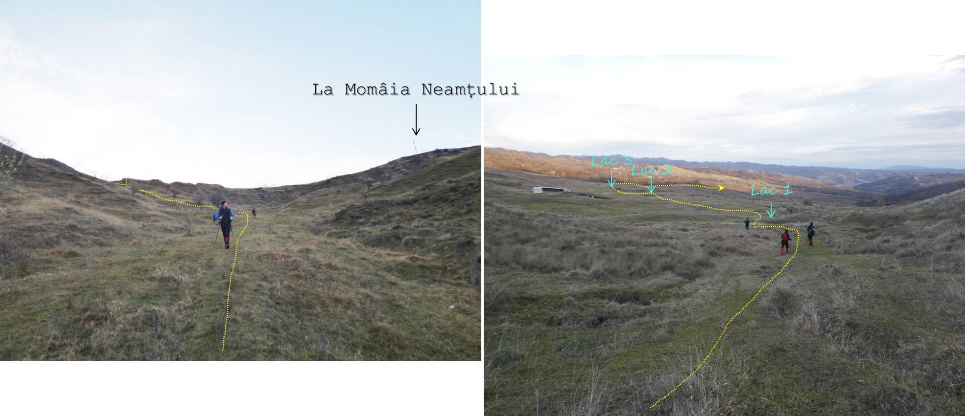 Rămânem pe curba de nivel de sub malul, înălțat antropic, al lacului și trecem după câteva zeci de metri pe lângă o baltă seacă, ce se activează însă la topirea zăpezilor sau după ploi mai zdravene !