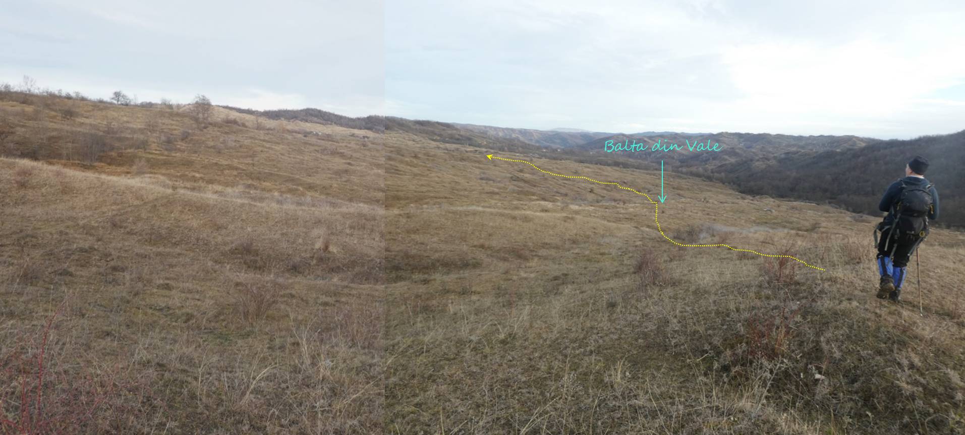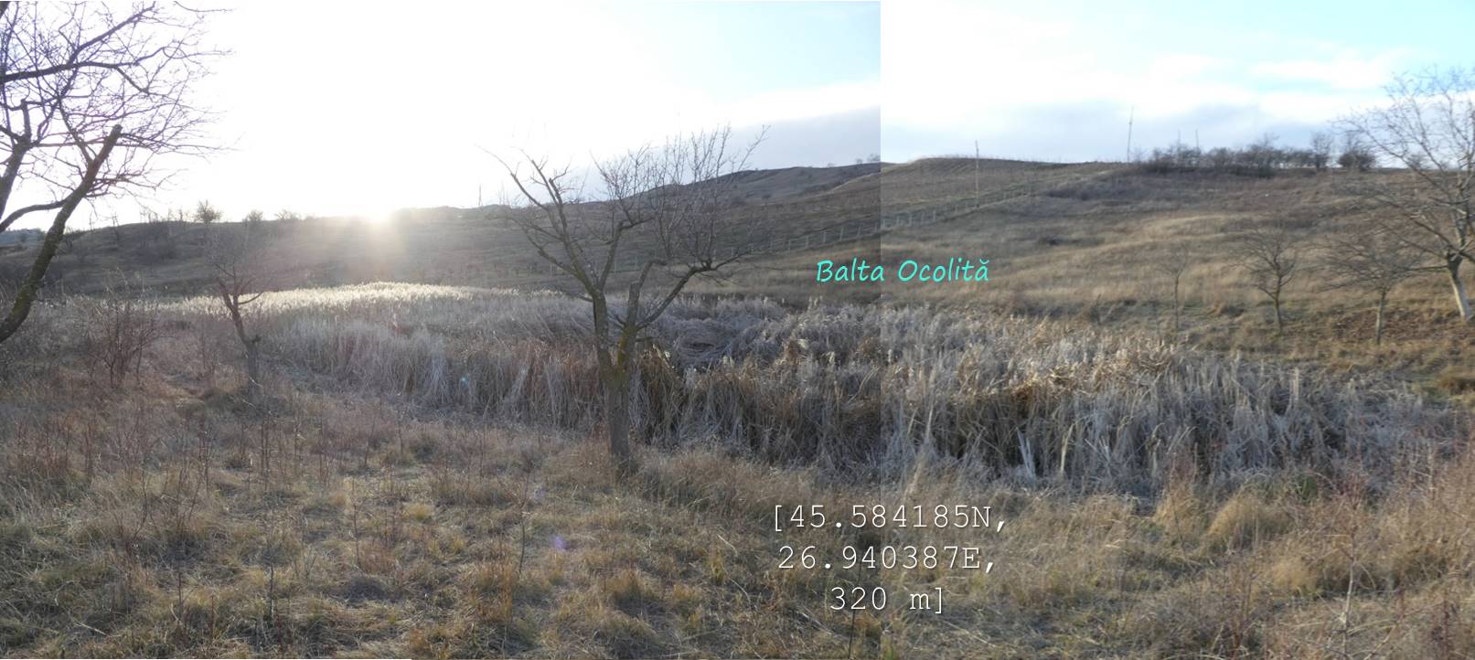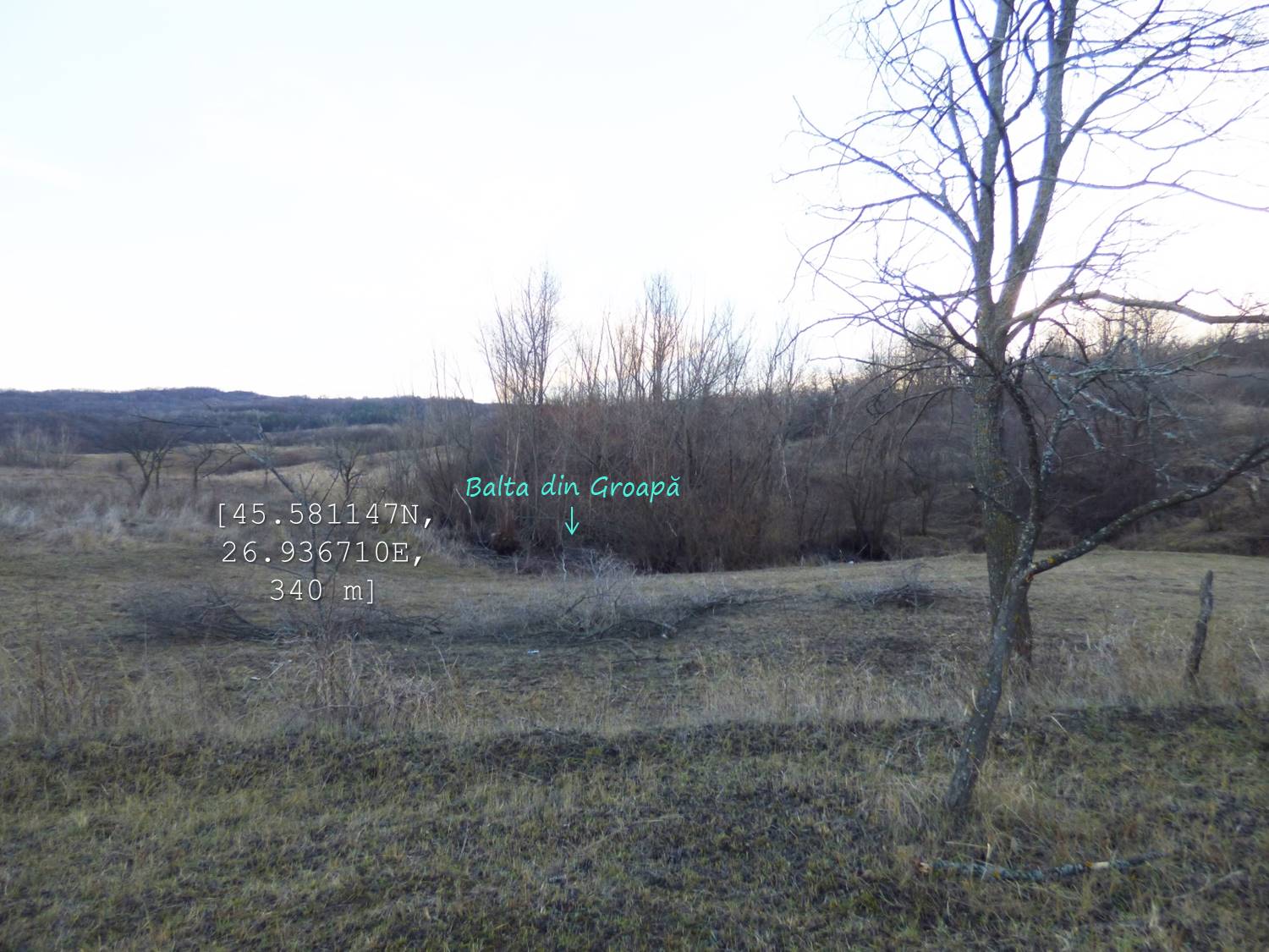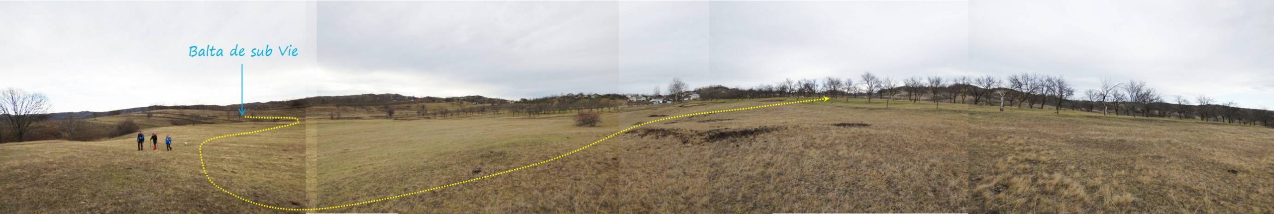 … cum spuneam, suind ușor spre nord-vest, pe un drumeag de căruțe așternut pe șleaul unei vâlcele evazate. Zărim, mai mult sau mai puțin departe/aproape, o baltă pe care, desigur o trecem în inventar !
