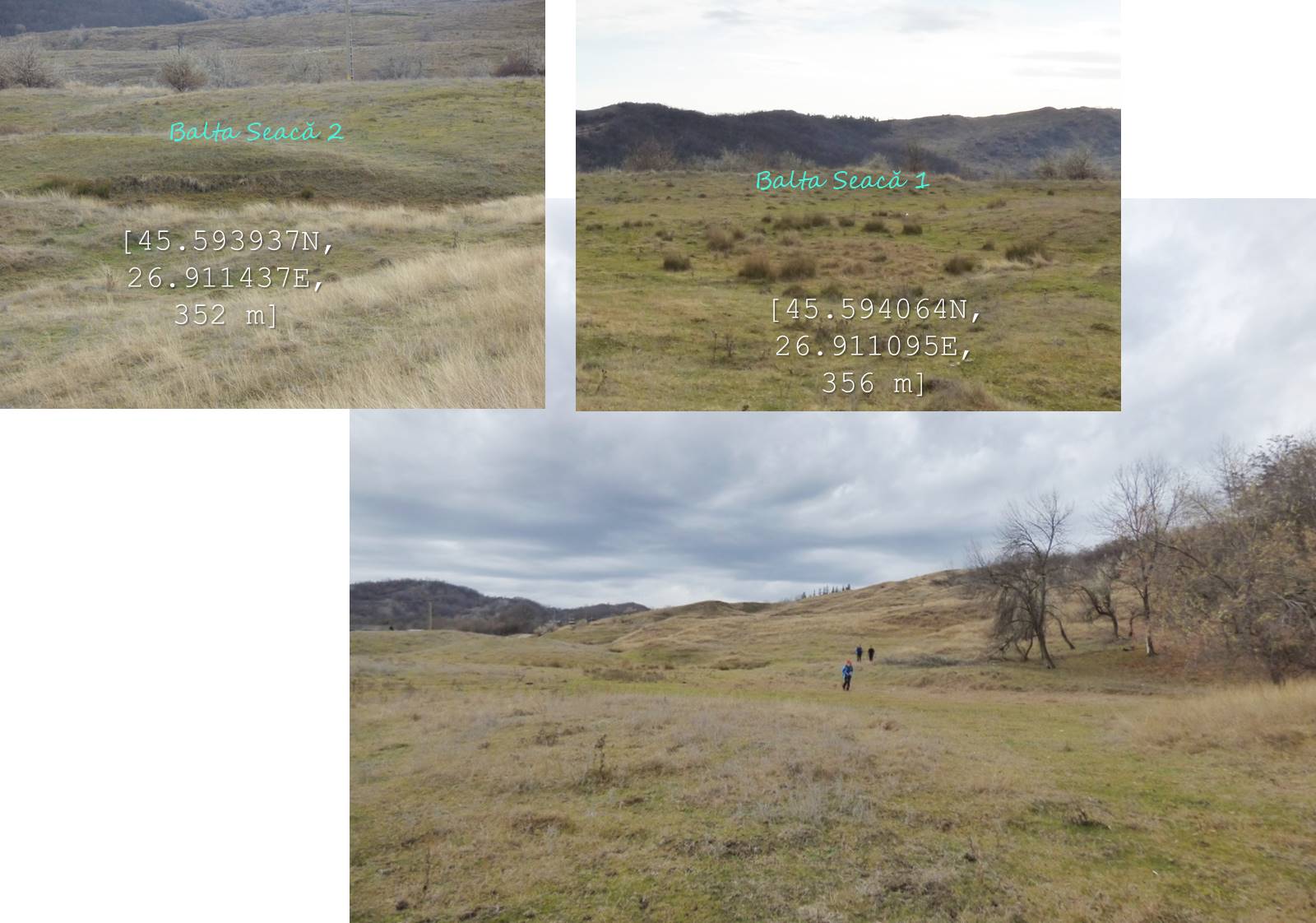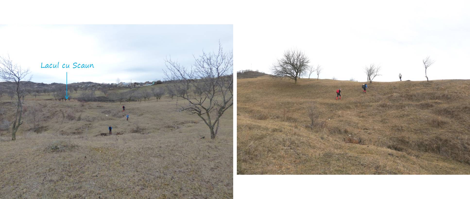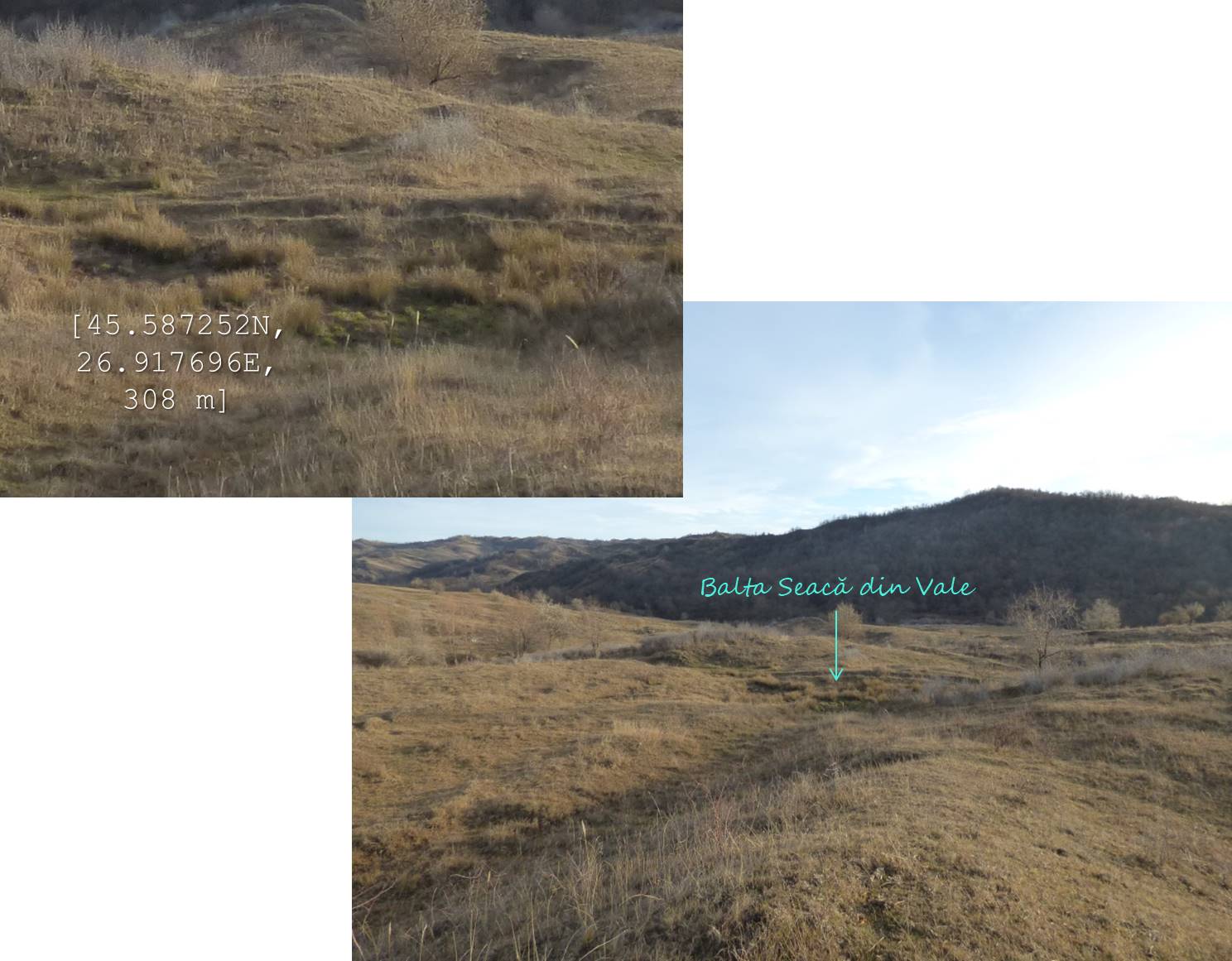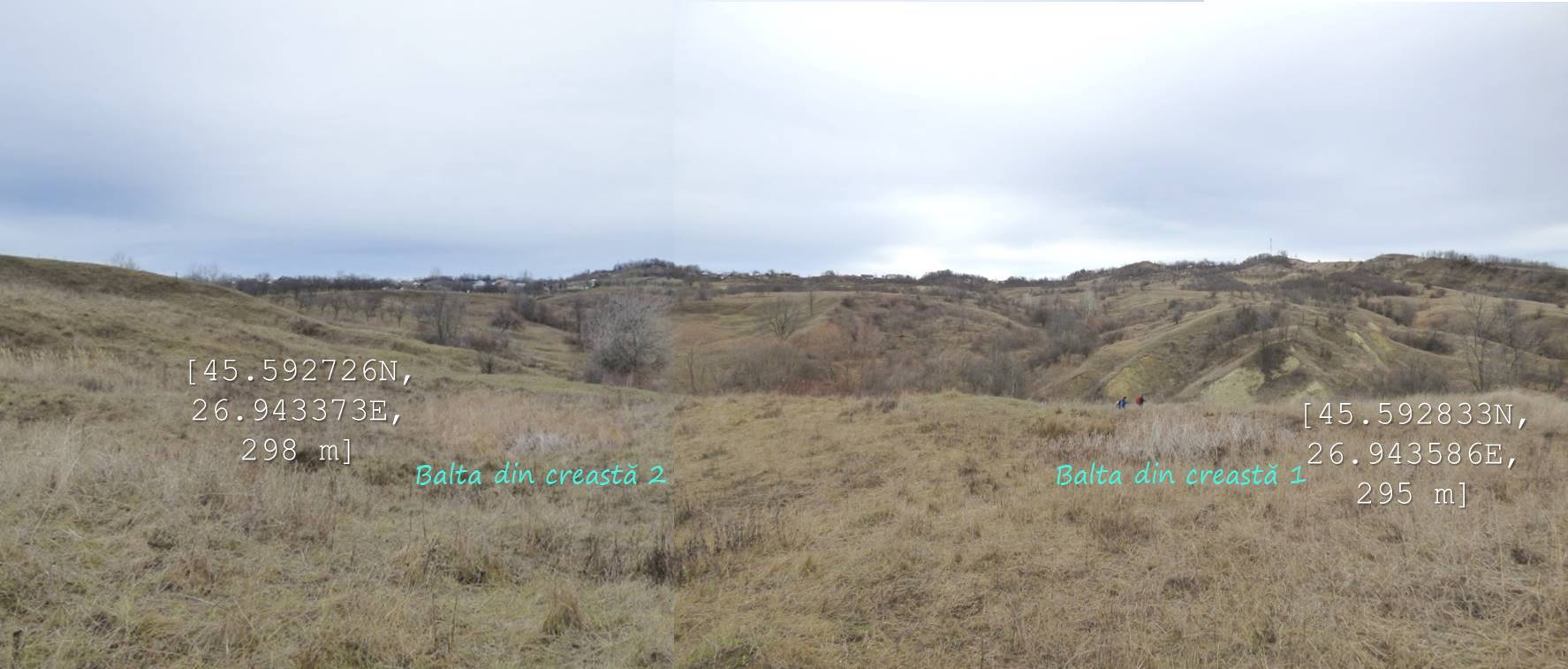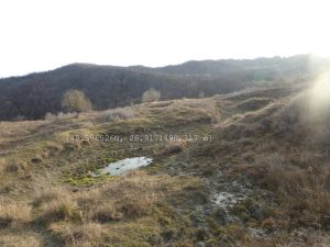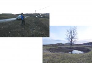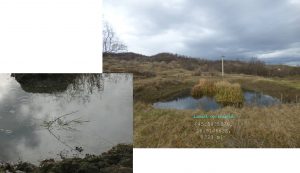 … ajungând astfel pe o treaptă largă de alunecare unde apa directă din precipitații sau cea de șiroire de pe versantul dealului stagnează temporar în două bălți mai … răsărite, acum seci !
