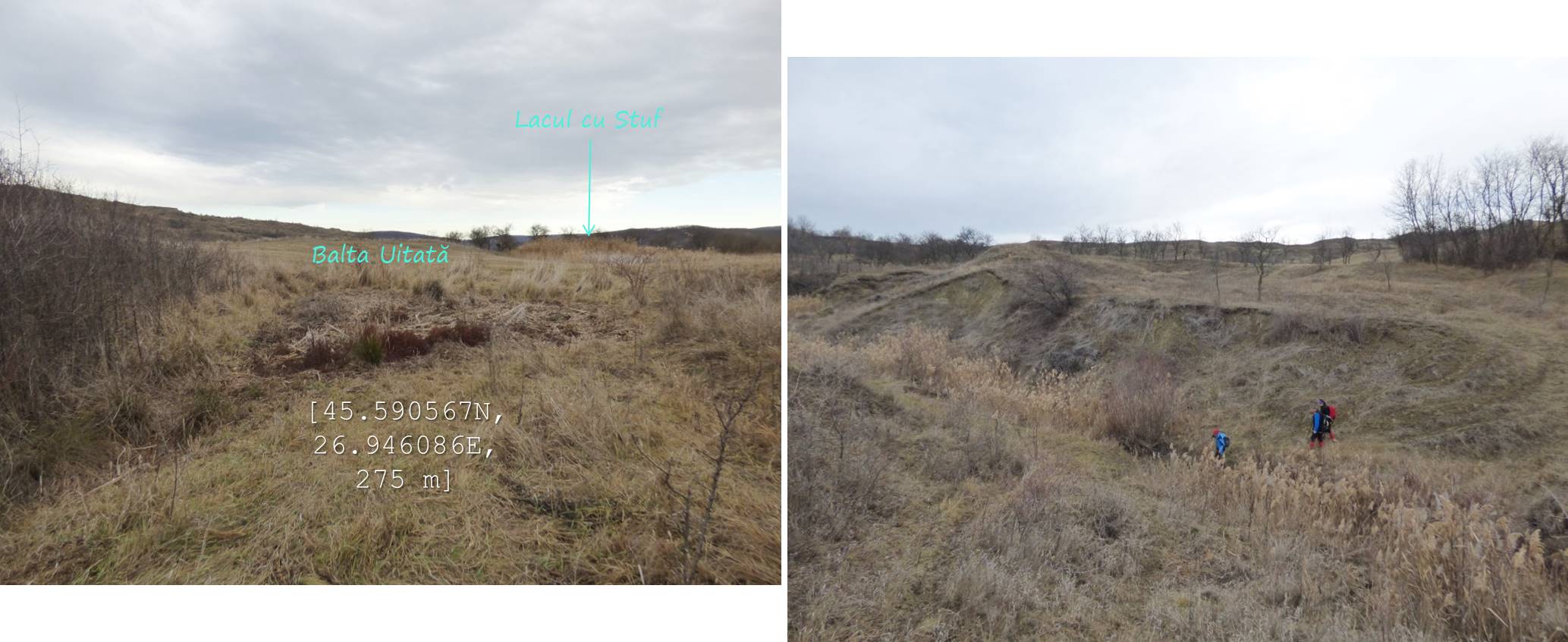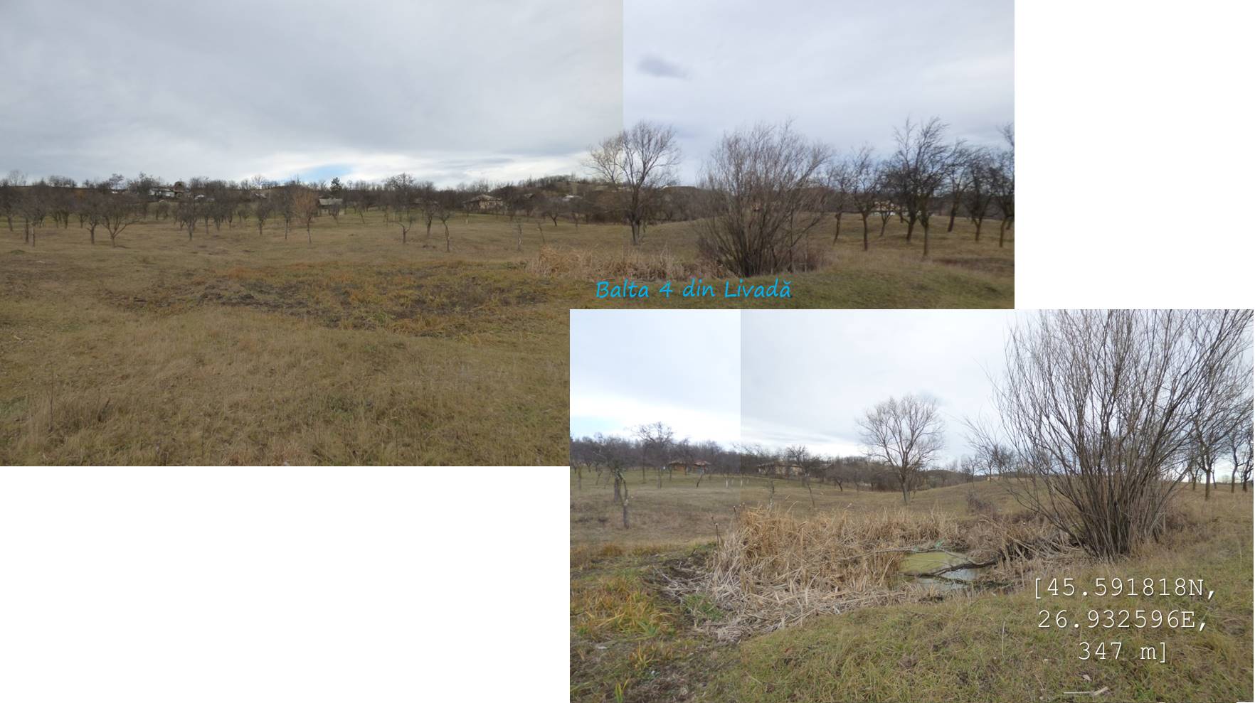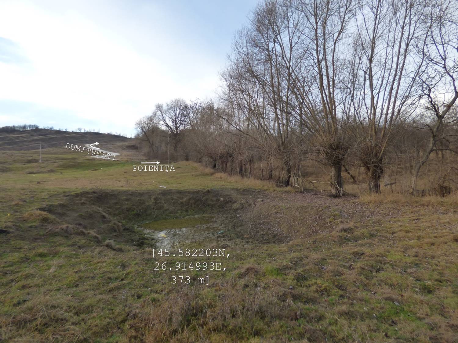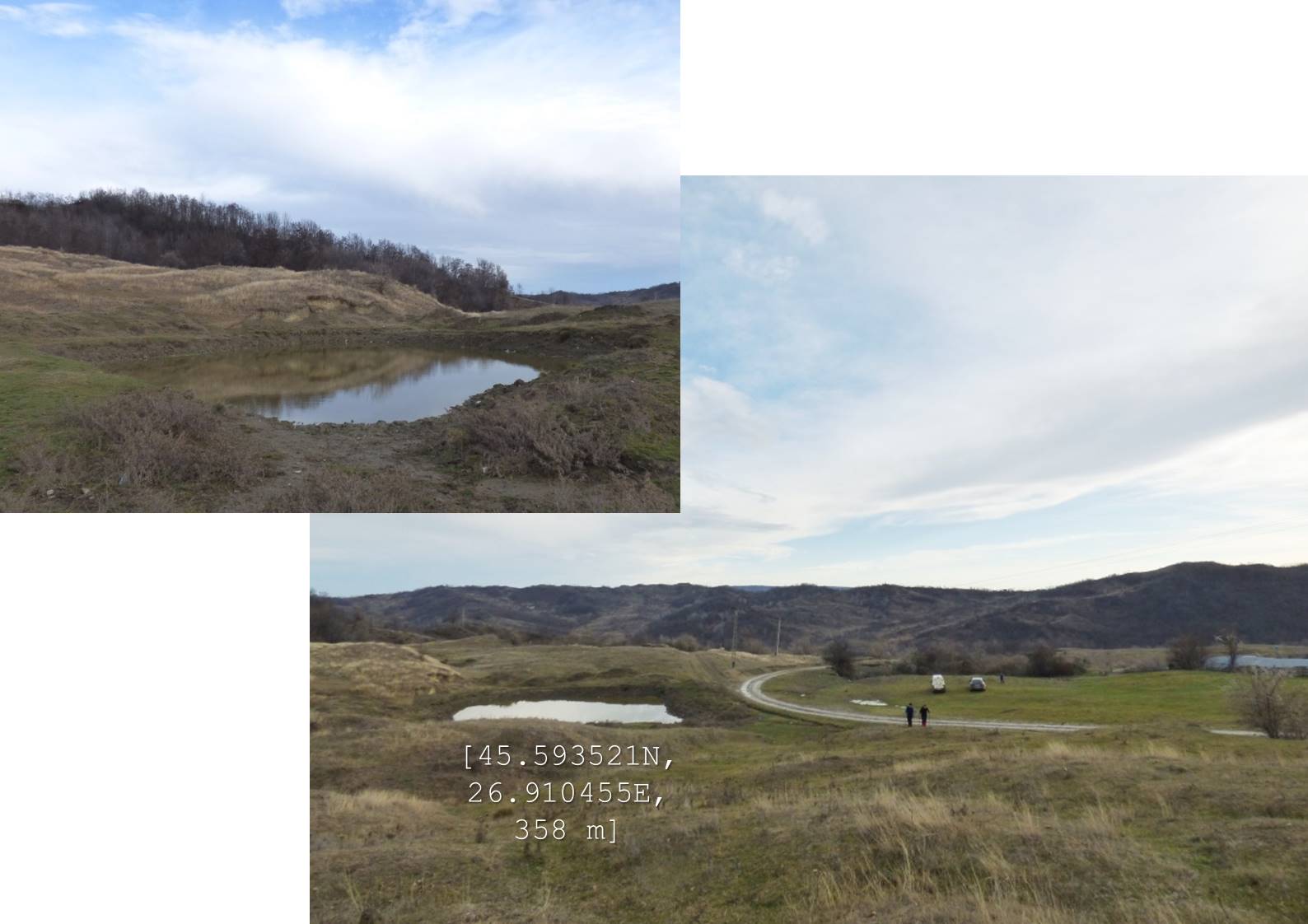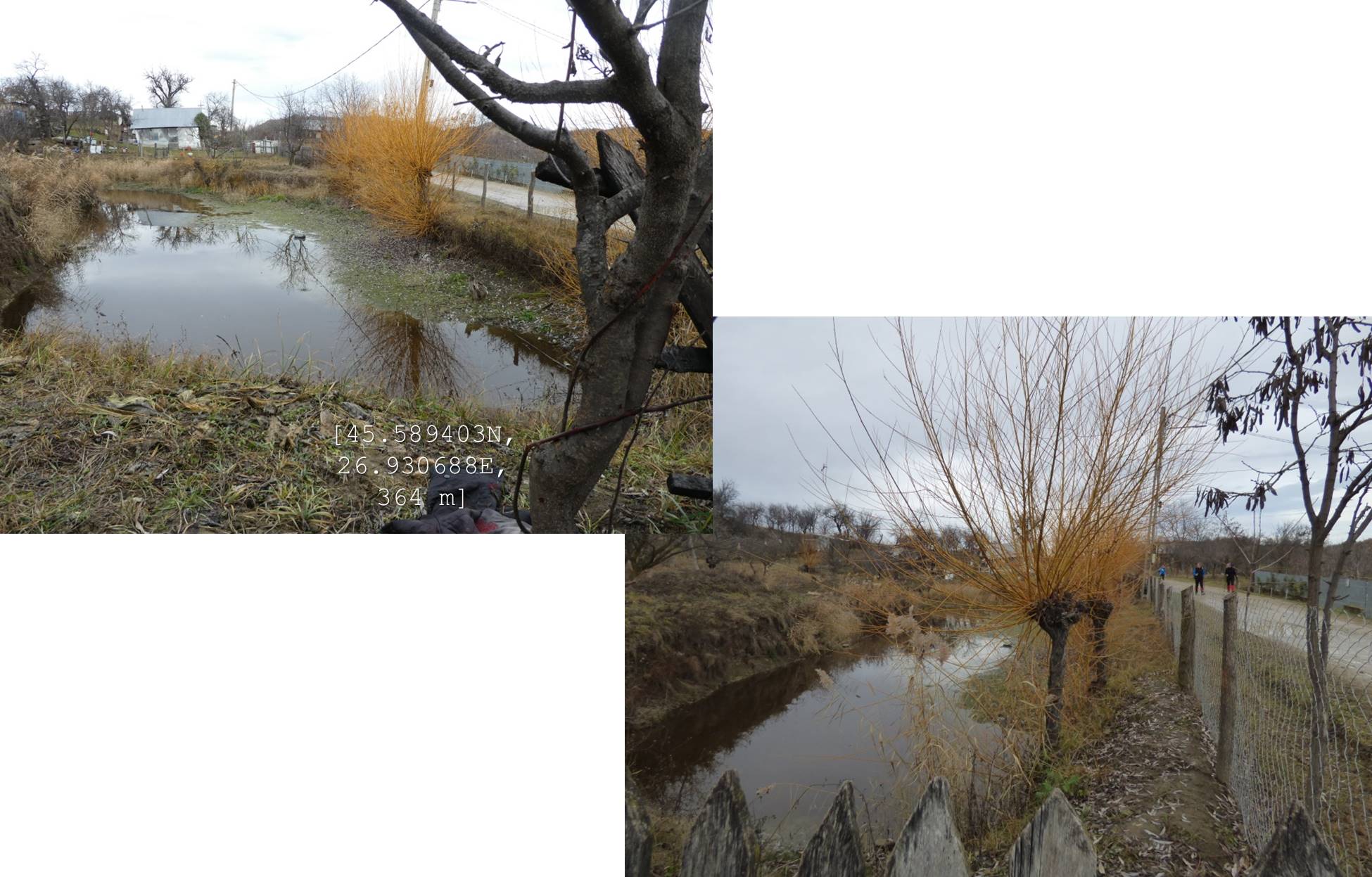 Sub aceeași formă – fotoreportaj -prezentăm mai jos foarte multele lacuri, bălți, iazuri, zăcători – adăpători, naturale sau antropizate/antropice -, permanente sau temporare, altele mai mult sau mai puțin seci, din arealul comunei vrâncene Dumitrești. Cele 50 văzute de noi cu prilejul unei drumeții … tomnatice de o zi (17 decembrie 2022), … ineluctabil scurtă, cărora li se adaugă încă un potențial în valoare de vreo 60 de … bucăți ratate (ne)voit, sunt, chiar și așa, o parte din oferta zonei. De ce atât de multe într-un spațiu atât de restrâns ? Nefiind specialiști nu putem lămuri chestiunea; dar înțelegem că relieful specific, supus alunecărilor trecute și prezente (aceasta fiind cauza de formare a celor naturale, ce ocupă cuvete localizate pe trepte de alunecare), nivelul și volumul pânzei freatice, ocupațiile locuitorilor, sunt dintre factorii care au favorizat această particularitate; apropo de antropizare, față de ceea ce am mai văzut și în alte locuri, adică lăculețe amenajate ca adăpători, de regulă, la origine zăcători (ale apelor meteorice provenie din ninsori, ploi, șiroiri de pe versanți), aici am constatat o preocupare generală de a draga bălți naturale cu scopul de a le utiliza ca rezervoare de apă.