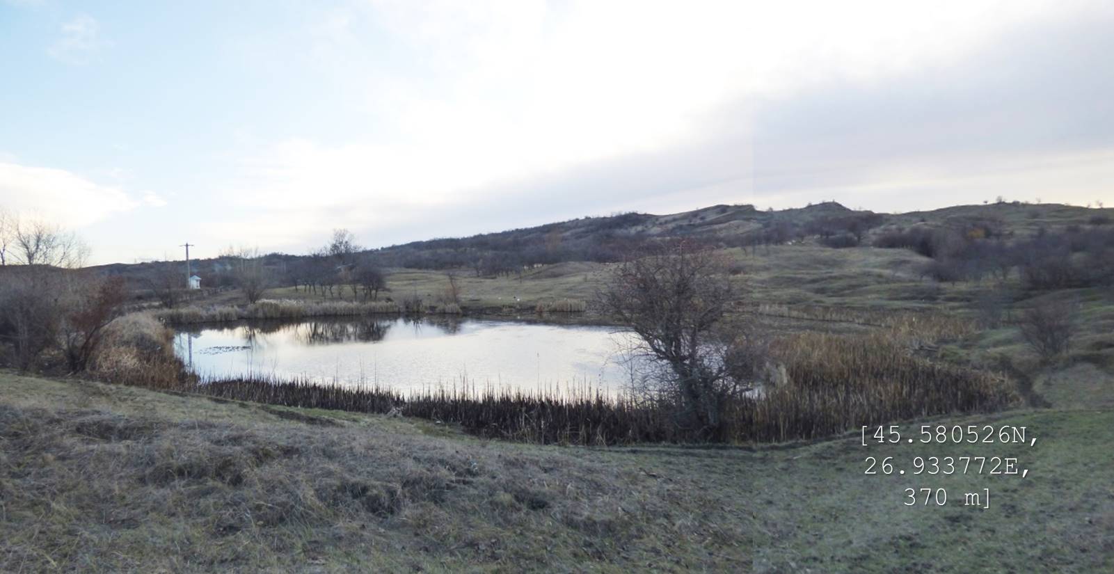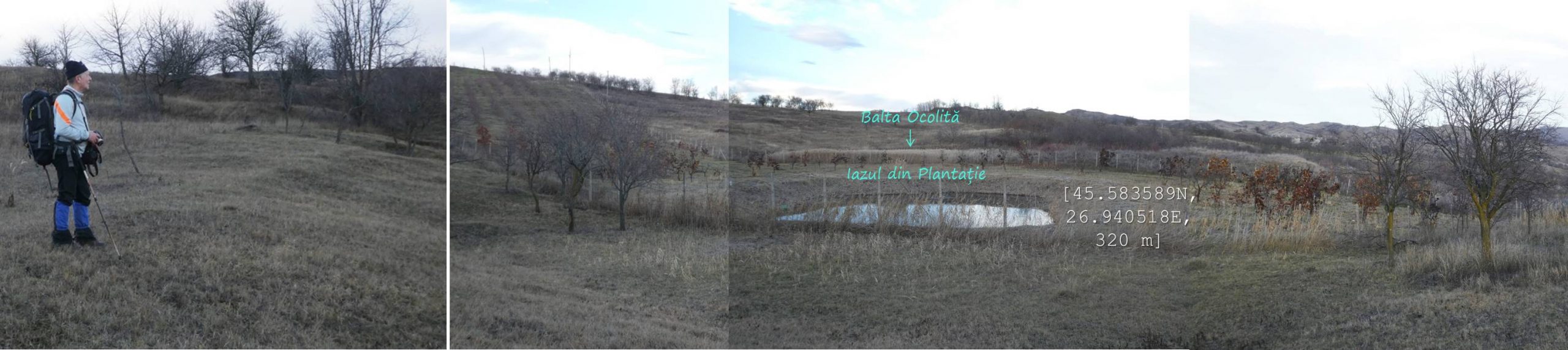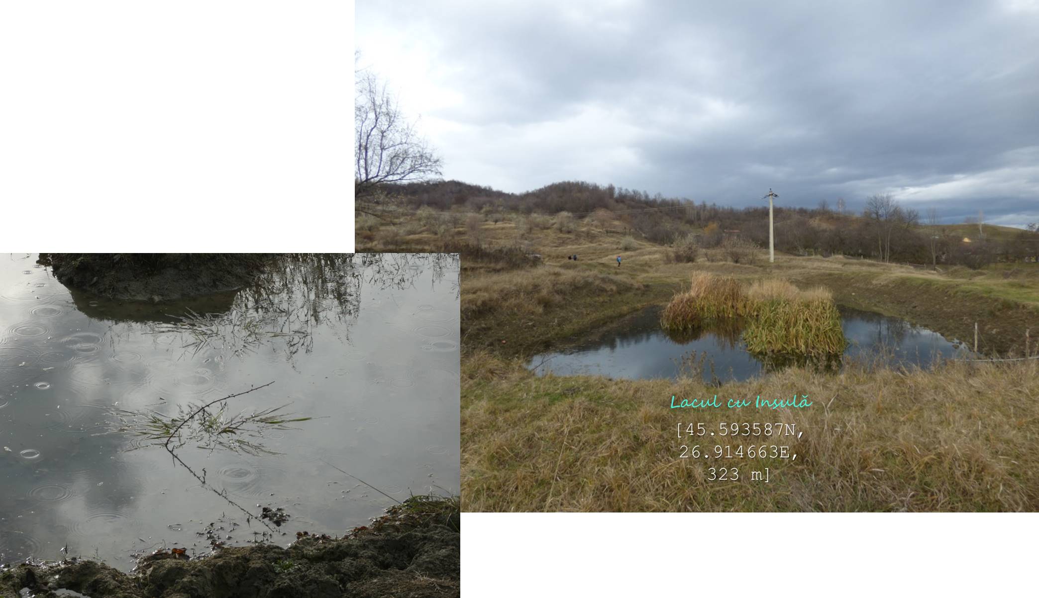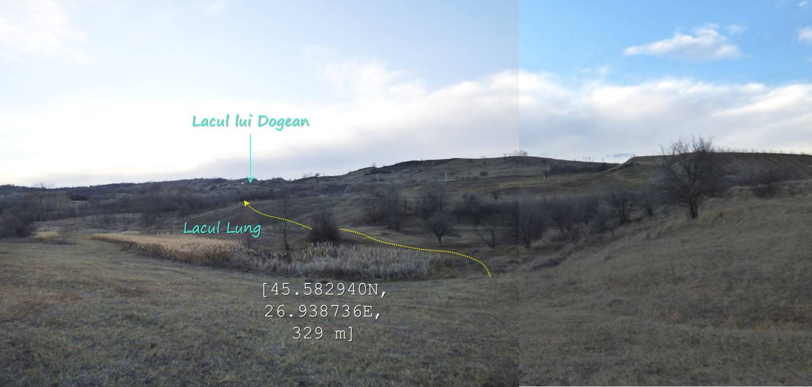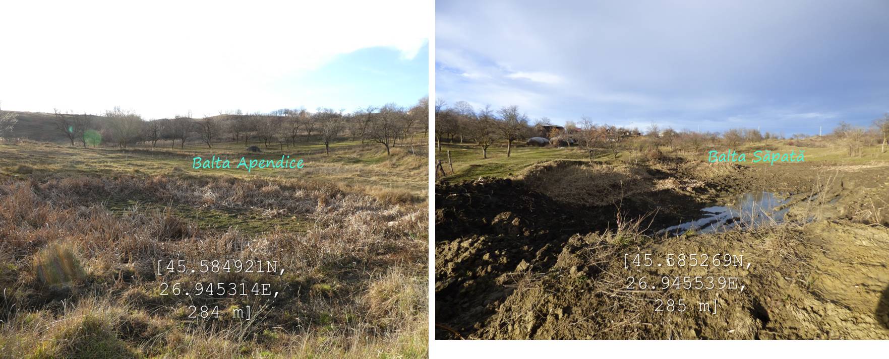 Sub aceeași formă – fotoreportaj -prezentăm mai jos foarte multele lacuri, bălți, iazuri, zăcători – adăpători, naturale sau antropizate/antropice -, permanente sau temporare, altele mai mult sau mai puțin seci, din arealul comunei vrâncene Dumitrești. Cele 50 văzute de noi cu prilejul unei drumeții … tomnatice de o zi (17 decembrie 2022), … ineluctabil scurtă, cărora li se adaugă încă un potențial în valoare de vreo 60 de … bucăți ratate (ne)voit, sunt, chiar și așa, o parte din oferta zonei. De ce atât de multe într-un spațiu atât de restrâns ? Nefiind specialiști nu putem lămuri chestiunea; dar înțelegem că relieful specific, supus alunecărilor trecute și prezente (aceasta fiind cauza de formare a celor naturale, ce ocupă cuvete localizate pe trepte de alunecare), nivelul și volumul pânzei freatice, ocupațiile locuitorilor, sunt dintre factorii care au favorizat această particularitate; apropo de antropizare, față de ceea ce am mai văzut și în alte locuri, adică lăculețe amenajate ca adăpători, de regulă, la origine zăcători (ale apelor meteorice provenie din ninsori, ploi, șiroiri de pe versanți), aici am constatat o preocupare generală de a draga bălți naturale cu scopul de a le utiliza ca rezervoare de apă.