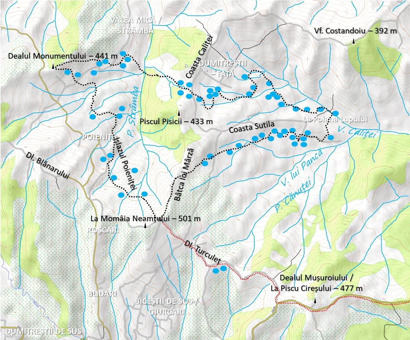 | 12. | 45.597445N, 26.921575E, 275 m | 44. | 45.593113N, 26.935441E, 344 m |