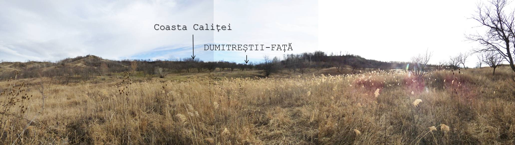 Sus, sub primele case ale satului Dumitreștiii-Față, pe stânga drumului ce suie pe Coasta Caliței, există o baltă în plin proces de dragare, …