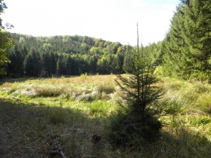 (Dacă am coborî uşor pe drum circa 5 minute, am ajunge deasupra unei alunecări recente – orientată transversal spre firul văii Păltinatei – pe pragurile căreia sălăşluiesc alte două bălţi minore, scoase în evidenţă de vegetaţia lacustră specifică ce a sufocat ochiurile de apă iniţiale.) De pe interfluviu ne lăsăm la nivelul bălţii, traversăm zona frământată în urma marii rupturi şi ajungem la coada alunecării deasupra căreia se află poiana ce găzduieşte stâna părăsită. Dincolo de clădirea ei, pe la marginea pădurii, pe un drum de exploatare ce se orientează aproximativ spre nord, pătrundem imediat în pădure.