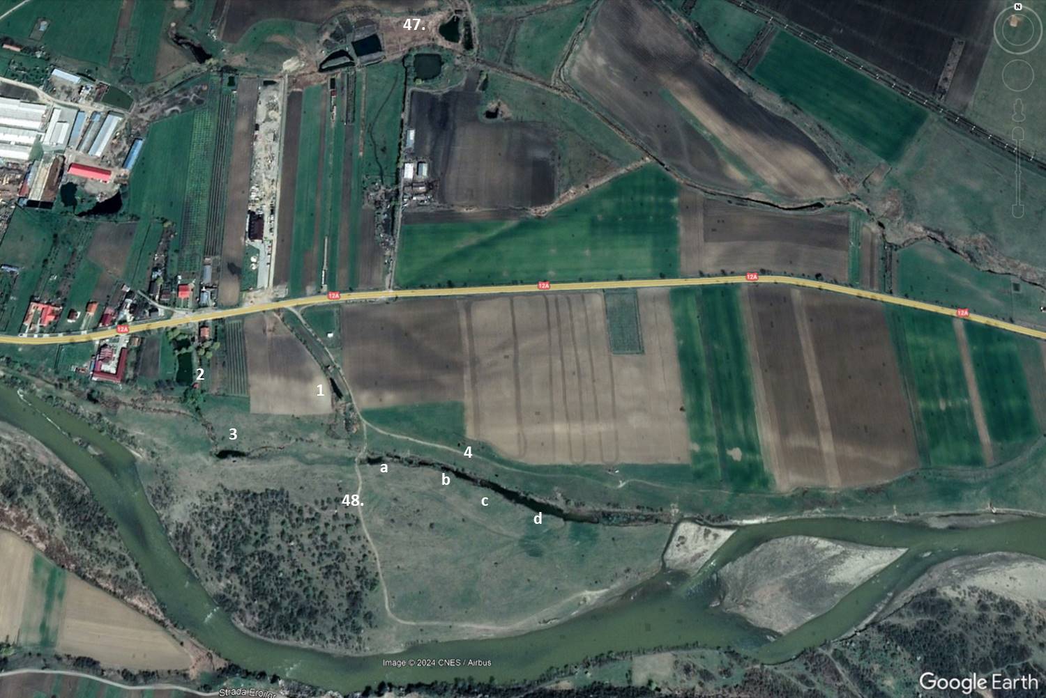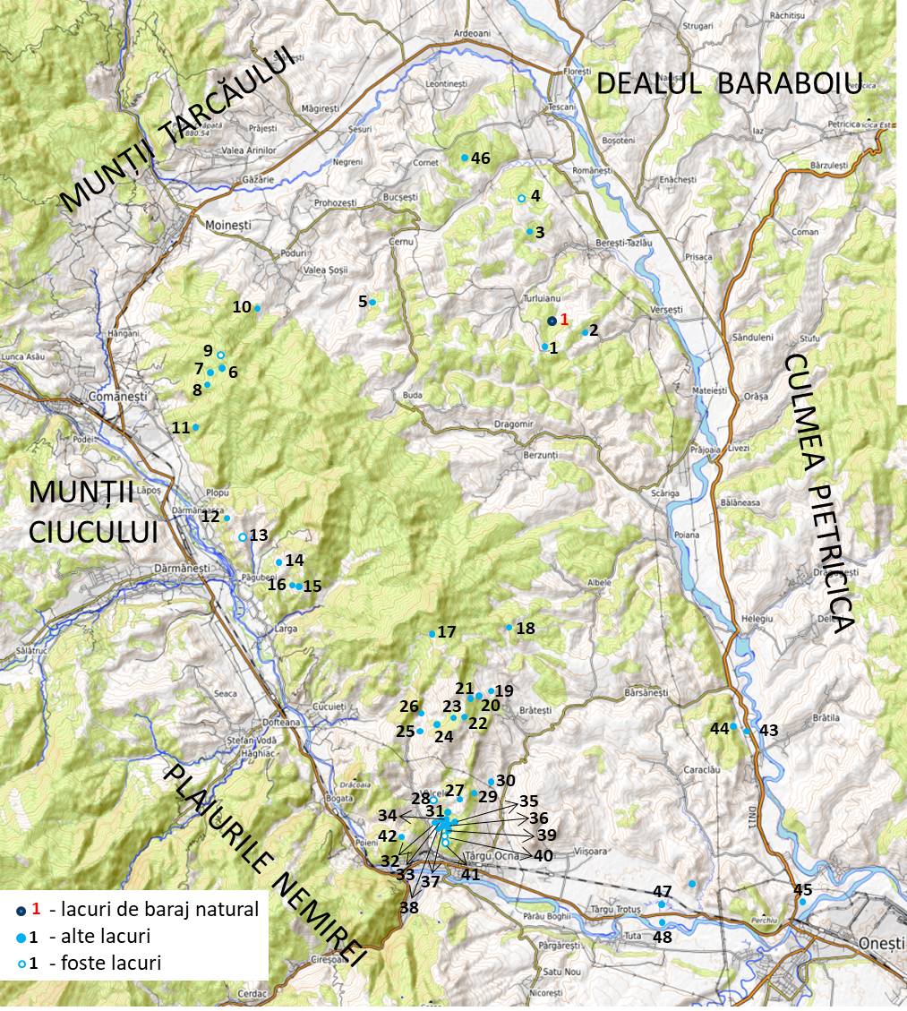 47. Relevăm și existența mai multor iazuri, încă nevizitate de noi, unele provenite, poate, din foste bălți naturale, cantonate sub a doua terasă a Trotușului – în dreptul localității Târgu Trotuș (46.268231N; 26.706145E; 228 m) – și alimentate de izvoare în pânza freatică de sub terasă.