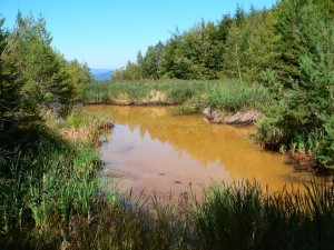 La doar 200 m de suiş, când panta se orizontalizează, ajungem în dreptul unui prim lac, Lacul cu Rugină, cel mai mic, aflat la câţiva metri în stânga drumului (46o31’43,91”; 26o23’13,97”; 790 m). L-am numit astfel, pentru că unul dintre cei doi mici contribuienţi ai săi cară la vale oxizi de fier; are emisar prmanent.