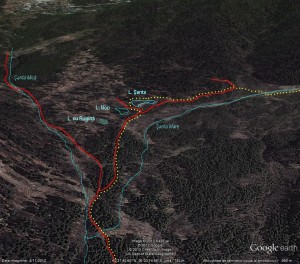 Ajungem într-o mică poiană în capătul aval al evantaiului de obârşii ale Şantei Mari, la confluenţa a două pârâiaşe torenţiale cu apele zdrumicate de stânci. Urmăm, la început, cursul celui din dreapta (care izvorăşte din puţul sondei dezafectate), dar trecem, după vreo 50 de metri, deasupra albiei pârâului din stânga şi înfruntăm pieptiş malul abrupt drept al acestuia. În dreapta, cu 100 de metri mai sus, este vârful contrapantei, îmbrăcat cu stuf, al treptei pe care e cantonat lacul, dar înainte de a ajunge la el trebuie să ajungem dincolo de o ruptură a malului, pe un tăpşan întors parcă pe dos de vasta alunecare ce a generat lacul. Monticuli de pământ, parapeţi imenşi de beton, stâlpi, conducte rupte şi contorsionate spun câte ceva despre forţa alunecării. Poteca duce până aproape de platforma unei sonde în funcţiune la care nu ajungem însă şi deviem spre dreapta pentru a sui spre o mică şa formată pe creasta unui pinten ce ne-a străjuit flancul drept în ultima parte a urcuşului.