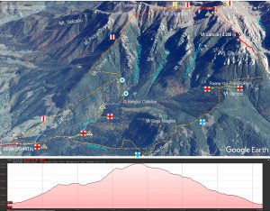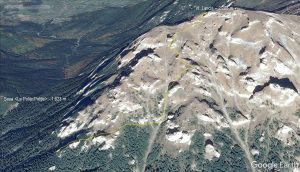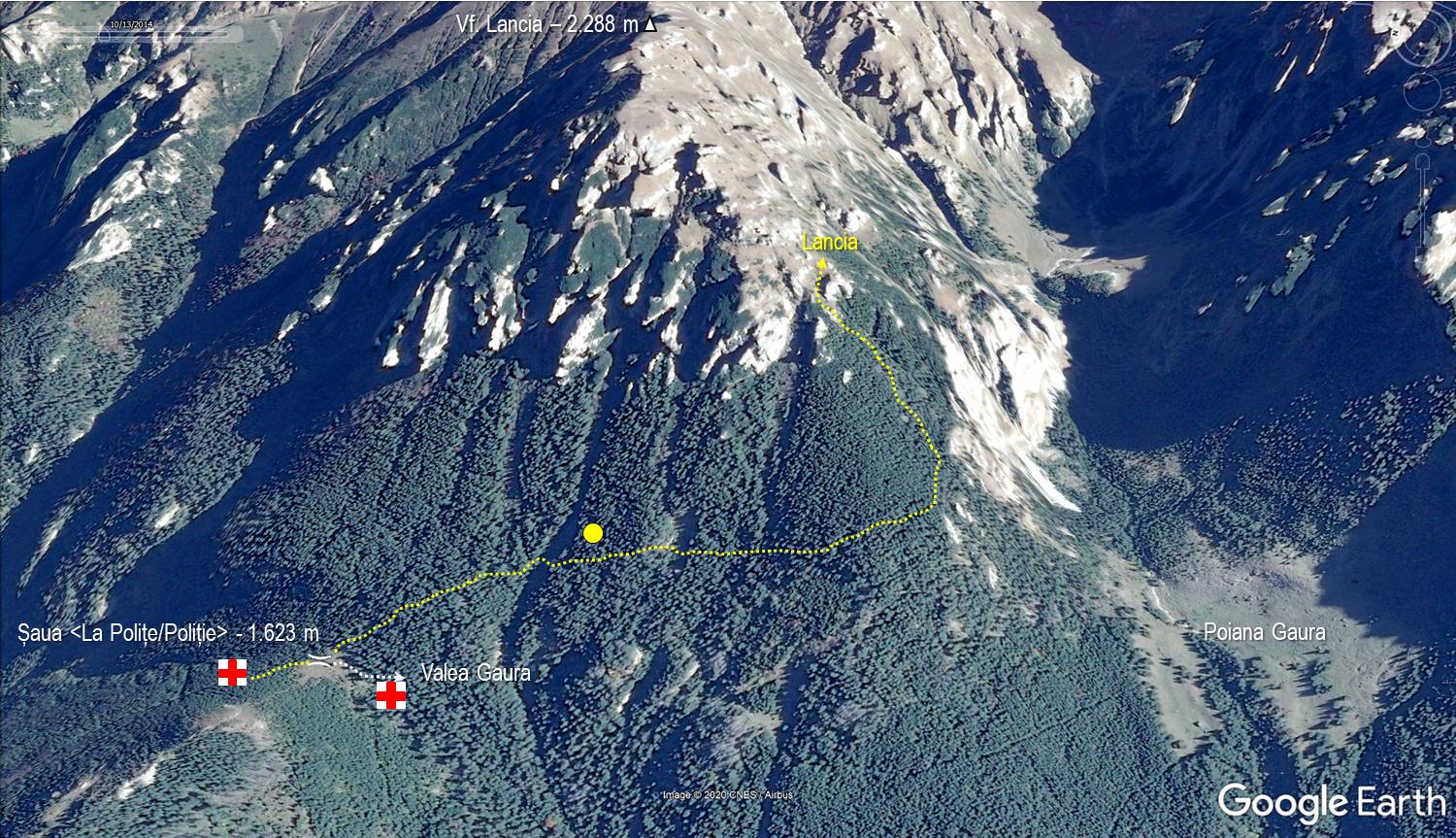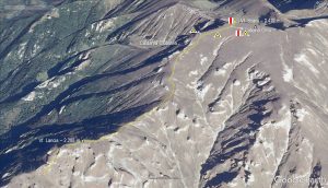 O potecuță de capre ne coboară pieziș, pe sub un perete de stâncă la firul unui horn torențial relativ larg. Pe el începem ascensiunea finală spre Vârful Lancia. Nu există un traseu prestabilit sau ideal, stând la intuiția noastră alegerea trasei care ni se pare cea mai lejeră în a ocoli colțanii, pereții sau pragurile de stâncă și a evita pantele prea abrupte ! Ajungem la … câțiva pași de vârf, sub un perete de stâncă ce pare inaccesibil; …