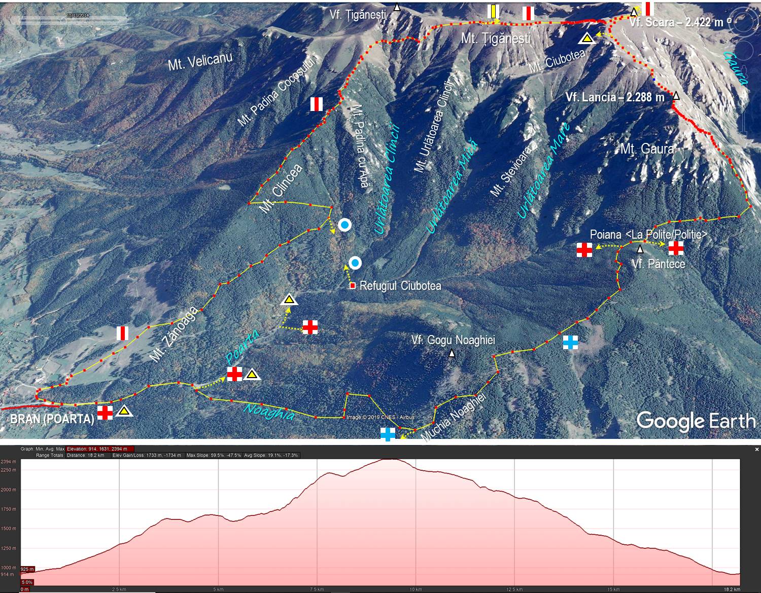 I.1. Bran (Valea Poarta, aprox. km 3,5) – Mt. Gogu Noaghiei – Poiana <La Polițe> – Vf. Lancia – Vf. Scara – Culmea Țigănești – Culmea Clincea – Pârtia de schi Zănoaga – Valea Poarta