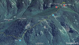 E bine să precizăm un aspect de neacceptat în materie de marcaje turistice, care s-a perpetuat nepermis chiar și în urma refacerii – altfel, aproape fără cusur -, de dată recentă, a acestora, despre care vorbim: faptul că primul traseu se intersectează cu traseul culmii principale a Bucegilor/Carpaților, marcat, cum se știe, cu bandă roșie; faptul se petrece pe Muntele Omu, nu departe de Cabana Omu și nu e greu de imaginat ce se poate întâmpla în caz de ceață sau viscol în punctul (zona) respectiv(ă) !