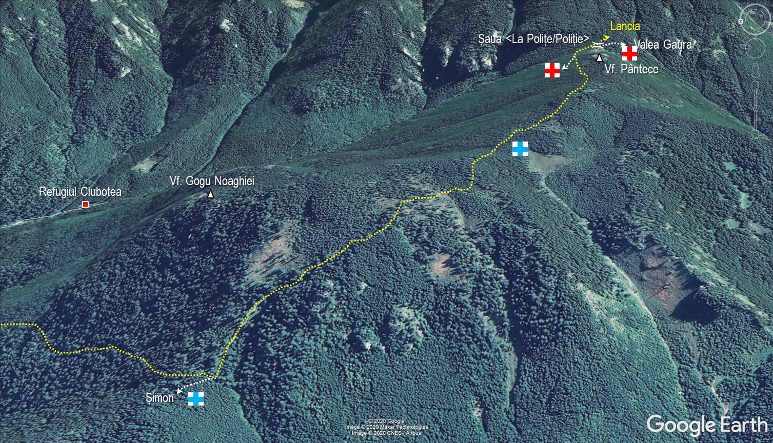 … am ajuns pe Muchia Noaghiei, într-o șa joasă, sub Vârful Gogul Noaghiei, unde întîlnim crucile albastre ale unui traseu vechi, dar cu marcajul recent refăcut, ce leagă cartierul brănean Șimon de șaua <La Polițe/Poliție>. Un drum de tractor ne aburcă cam … direct pe Gogul Noaghiei; marcajul nu îi este întrutotul fidel, îndulcindu-i panta dură și scurtcircuitându-i fragmente prea … lente sau în afara traseului. În tot acest timp rămânem mult sub vârful Gogului Noaghiei, precum și sub culmea ce-l unește cu următorul vârf, Pântece, de până <La Polițe/Poliție>, dar pe care o atingem în șaua dintre cele două vârfuri. De aici urcăm pe muchia Muntelui Pântece, dar în departe de vârf poteca marcată se lasă sub el, spre stânga, pe versantul nordic al vârfului, coborând binișor până ce întâlnește traseul “cruce roșie”. De la intersecție recâștigăm puțin din altitudinea pierdută pentru a ajunge în poiana <La Polițe/Poliție>; denumirea ar fi legată de existența aici, încă de dinainte de primul Război Mondial, a unui post de pază. În – mult timp – cel mai popular ghid al Munților Bucegi (de Emilian Cristea și Nae Dimitriu, apărut în două ediții, în 1962 și 1964) găsim denumirea Poiana dintre Văi.