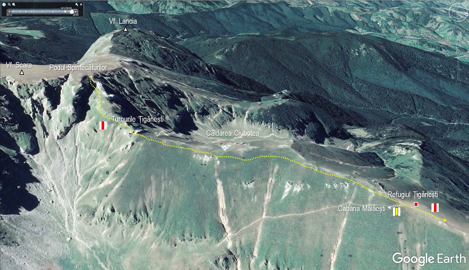 … chiar dacă nu e, poate fi ocolit lejer prin stânga pentru a sui, fără riscuri inutile, pe platoul somital al Lanciei. De aici îi urmărim, în coborâre, muchia ce devine din ce în ce mai îngustă, aflându-ne curând cu mai bine de 100 de metri mai jos. Urmează să remontăm … pierderea în altitudine și să mai adăugăm cel puțin pe atât pentru a ajunge sub sau pe Vârful Scara, întâi la poteca marcată cu triunghi galben – care spre stânga coboară în Căldarea Ciubotea – și apoi la cea marcată cu triunghi galben și bandă roșie, din aceasta desprinzîndu-se spre stânga poteca noastră, marcată doar cu bandă roșie.