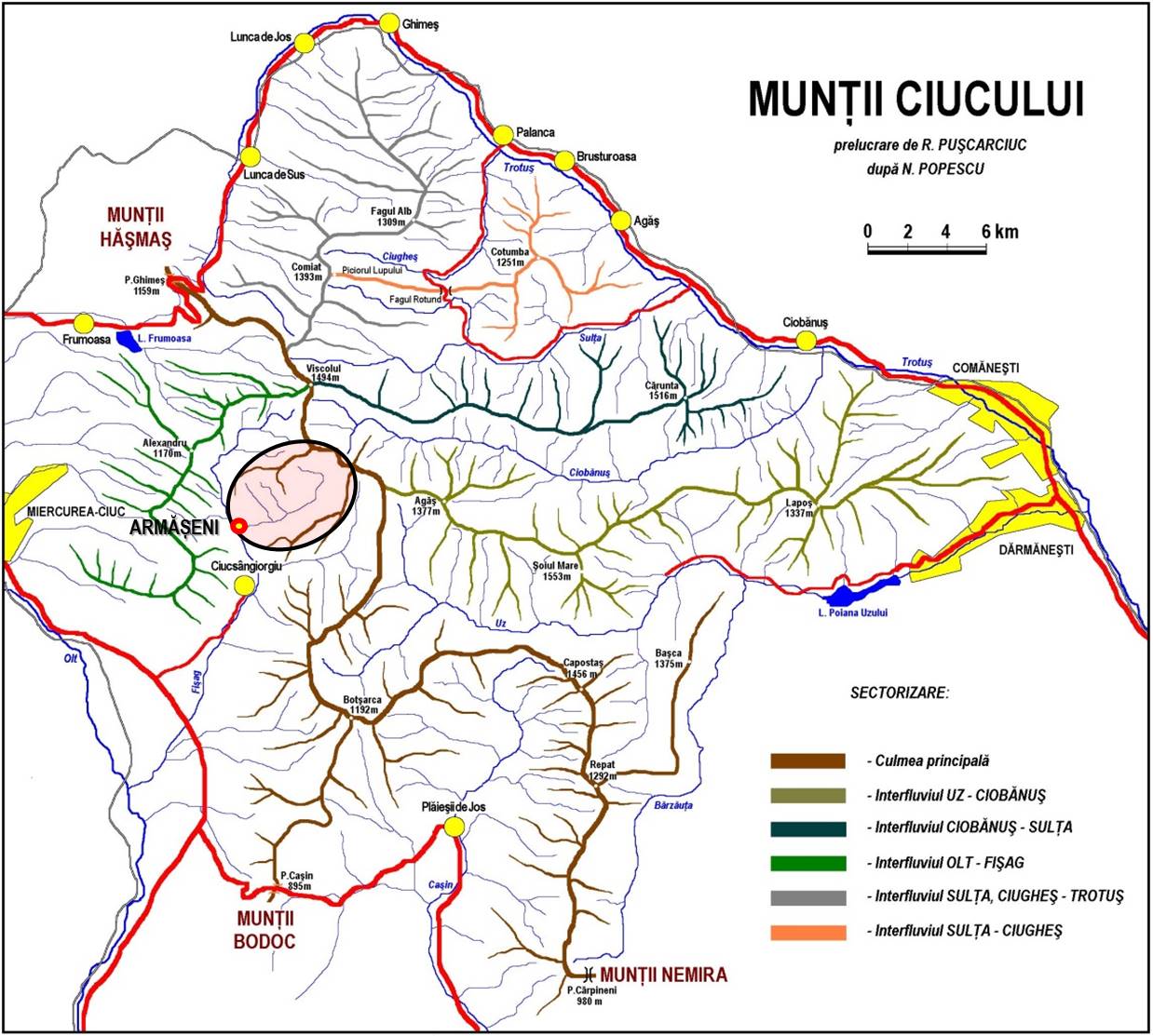 Traseu: Armășeni (Gura Topliței) – Mt. Armășeni – Mt. Caprei – Mt. Trecătorii – Mt. Fagului – Piscul Străjerului – Mt. Tomotul din Spate – Mt. Mic – Mt. Muierea Veselă – Mt. Altarului – Gura Topliței