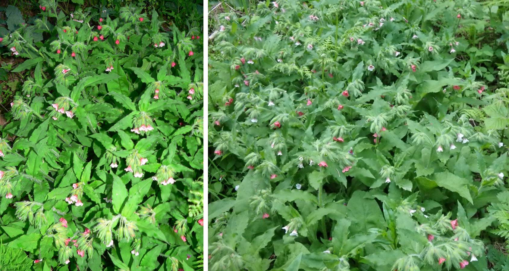 Monotonia specifică mersului pe drum forestier – în speță, cel de pe valea Mădărașului Mic – s-a întrerupt touși câteva momente, când am găsit o comunitate de cuscrișori (Pulmonaria rubra) cu flori de la roșul firesc, la alb; în plus și mult mai mici decât normal !