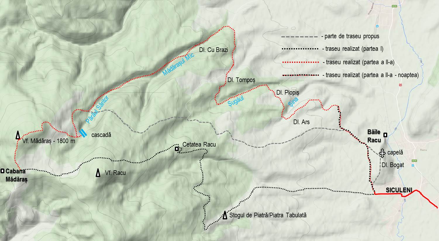 Traseu: Bifurcația Cabana Mădăraș-Vf. Mădăraș – Vf. Mădăraș – Cascada Pârâului Săritor – Valea Mădărașul Mic – Dl. cu Brazi – Dl. Tompoș – Valea Șugăului – Dl. Plopiș – Dl. Ars – Dl. Bogat – Siculeni