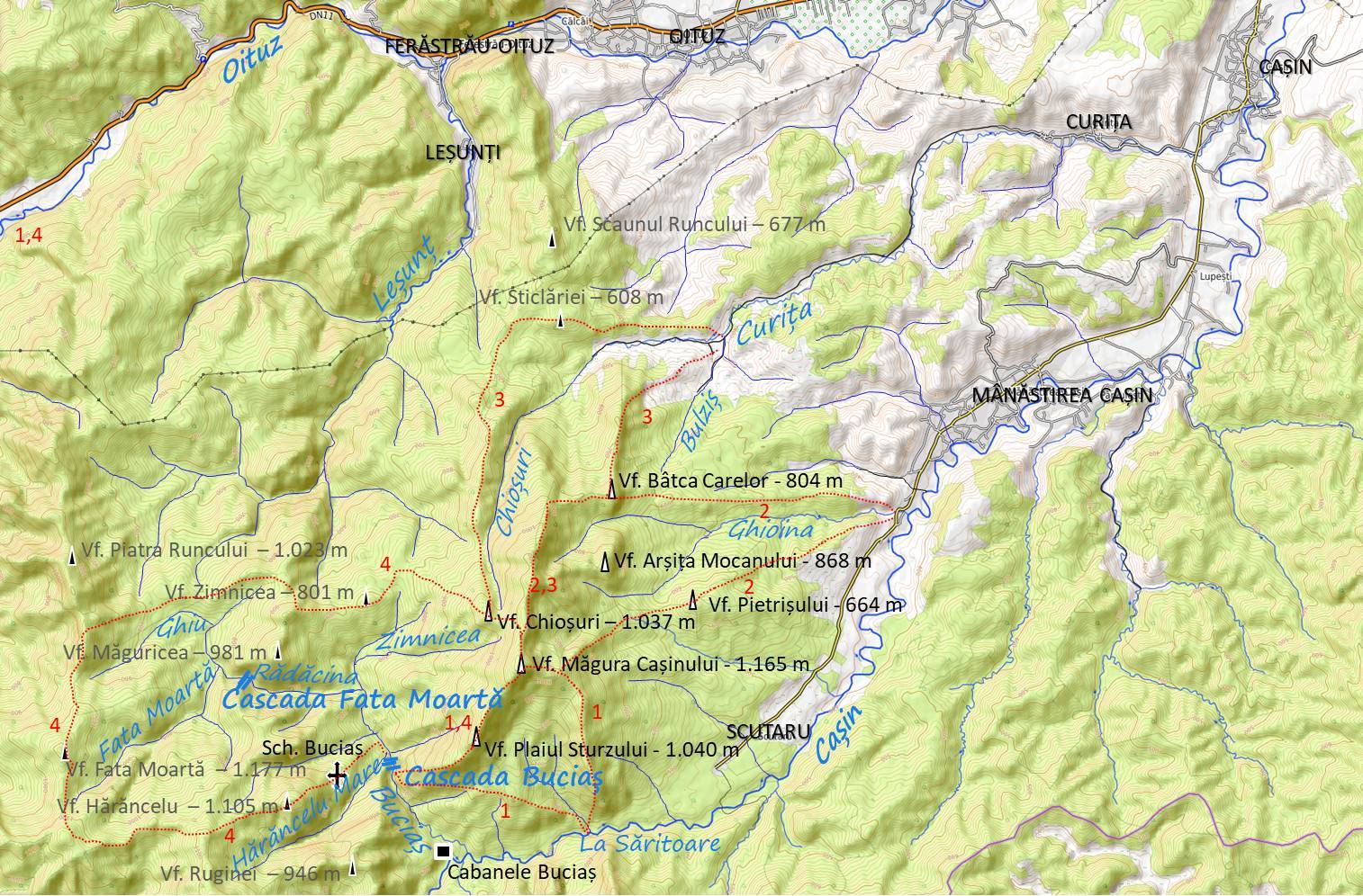 4. Valea Buciașului (Cascada Buciaș) – Piciorul Arsurii – Cornul Măgurii – Vf. Plaiul Sturzului – Vf. Măgura Cașinului – Vf. Chioșuri – Vf. Zimnicea – Plaiul Runcului – Vf. Fata Moartă – Vf. Hărăncel – Schitul Buciaș – Valea Buciașului – Cascada Buciaș.