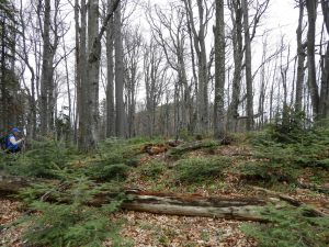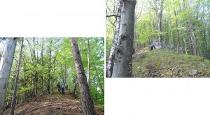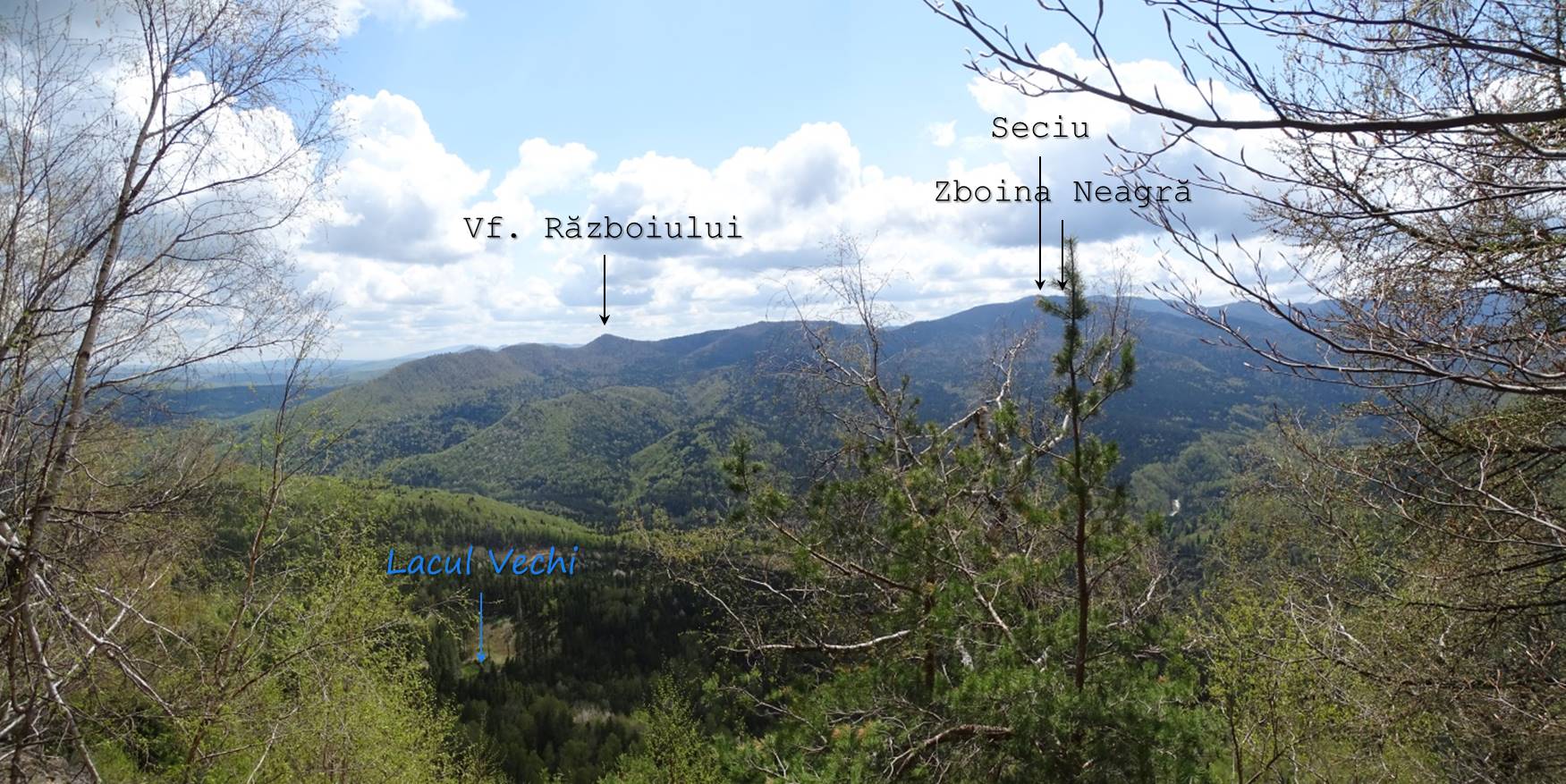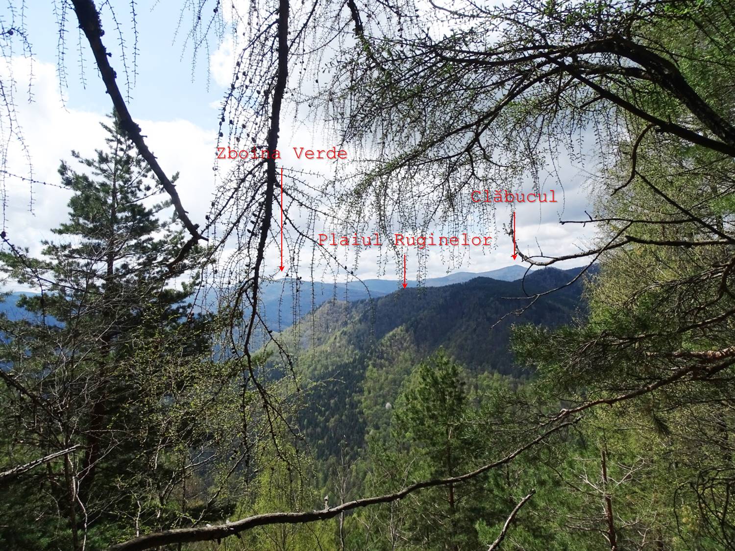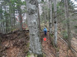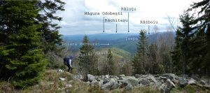 În plus, trebuie să fim foarte atenți, căci, după cca 15 minute de la părăsirea vârfului, va trebui (sic !) să observăm o bornă forestieră – marcată pe un fag și pe o piatră, dar al cărei număr l-am găsit șters. De la ea părăsim creasta urmărind spre dreapta – de fapt, înainte, căci creasta, datorită acestui aspect, mai … atractivă, se curbează ușor spre stânga – …