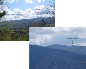 De pe vârf, coborâm strict spre est, orientându-ne, cel puțin până la individualizarea culmii, după benzile roșii verticale ale marcajului silvic de pe aceasta; …