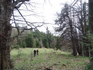 După popasul de rigoare părăsim poiana traversând-o prin mijloc, spre N-V, urmând un drumeag înțelenit, de tractor !