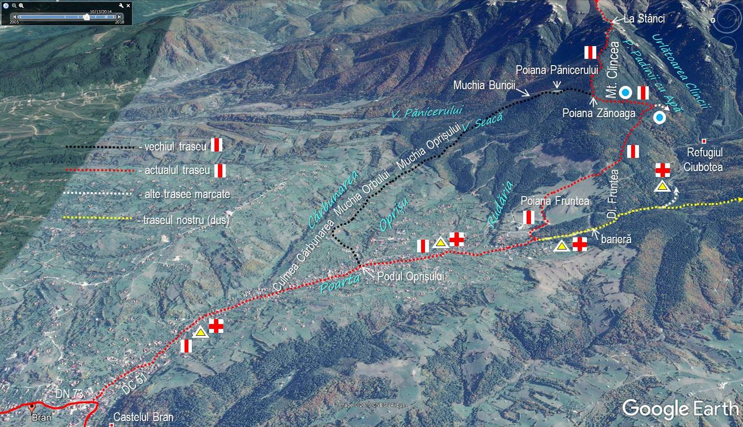 – Până prin, cel mai târziu, 2010, traseul pleca din satul Poarta (pe DN 73, foarte aproape de Castelul Bran, există indicatoare pentru ambele sensuri, pentru Poarta, aflat pe DC 51, asfaltat pe cca 4 km) din punctul numit Podul Oprișului (confluența pâraielor Poarta și Opriș); părăsea valea Porții și urca pe versantul drept al pârâului Opriș, interfluviu între el și Cărbunarea (Culmea Cărbunarea, Muchia Orbului, Muchia Oprișului), taia apoi obârșia Văii Seci (de Cărbunarea) trecând pe Muchia Buricii, interfluviu între aceasta și Valea Pănicerului, iar de aici suia prin Poiana Pănicerului (sau a Râșnovenilor) pe coama Muntelui Clincea, atingând-o în Poiana Zănoaga cum o numesc Em. Cristea și N. Dimitriu în binecunoscutul lor ghid, Bucegii, din 1961. Așa apare marcat traseul pe mai toate hărțile încă de largă circulație, unele dintre ele fiind pomenite mai sus.