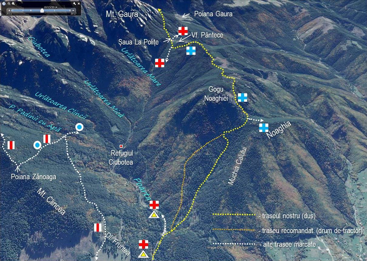 – Cum spuneam traseul drumeției noastre a suit pe versantul stâng al pârâului Poarta până în șaua nordică de sub Gogu Noaghiei; aici am întâlnit, de curând refăcut, marcajul “cruce albastră” ce vine din Șimon și duce până foarte aproape de șaua La Polițe/La Poliție – aici chiar a fost un post de pază -, sfârșind la întâlnirea cu “crucea roșie”, Bran (Poarta) – Valea Poarta – Șaua La Polițe – Valea Gaura – Cabana Omu.